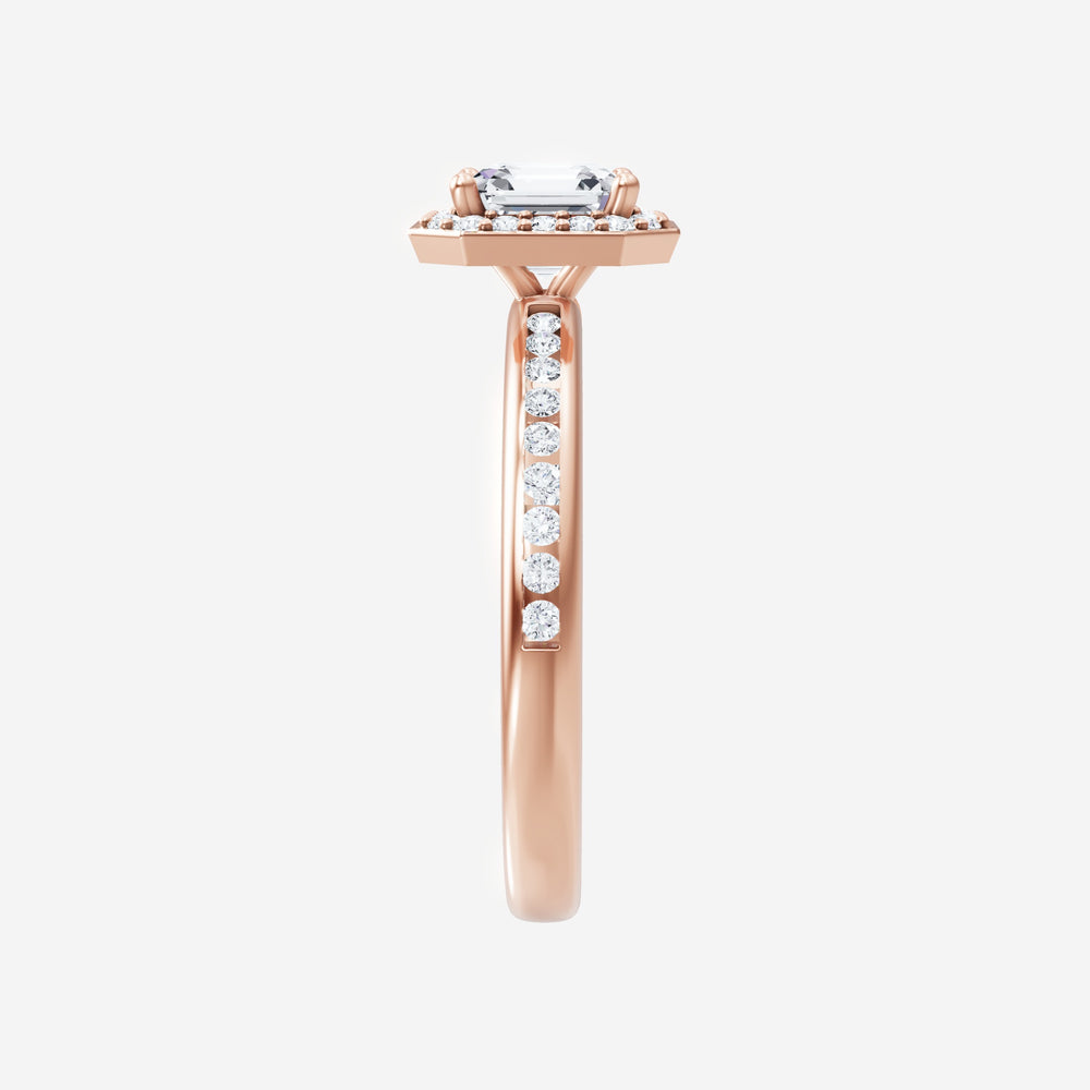 You’ve designed a ring that reflects lasting elegance and grace! Crafted from 14k Rose Gold, this exquisite Asscher lab-grown diamond is the centerpiece of this unique design. This Channel Set Shank with a Pave Halo head showcases the brilliance of the Asscher diamond, creating a timeless look. With this ring, celebrate every moment of joy, success, and love.