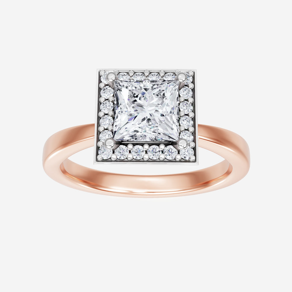 You’ve designed a ring that reflects lasting elegance and grace! Crafted from 14k Rose White Dual Tone, this exquisite Princess lab-grown diamond is the centerpiece of this unique design. This Bow Shank (Reverse Tapered) with a Pave Halo head showcases the brilliance of the Princess diamond, creating a timeless look. This stunning ring makes the perfect symbol of everlasting love and devotion.