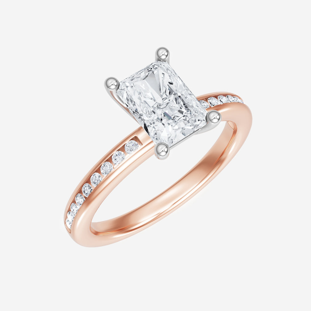 You’ve designed a ring that reflects lasting elegance and grace! Crafted from 14k Rose White Dual Tone, this exquisite Radiant lab-grown diamond is the centerpiece of this unique design. This Channel Set Shank with a 4 Prong Head head showcases the brilliance of the Radiant diamond, creating a timeless look. With this ring, celebrate every moment of joy, success, and love.