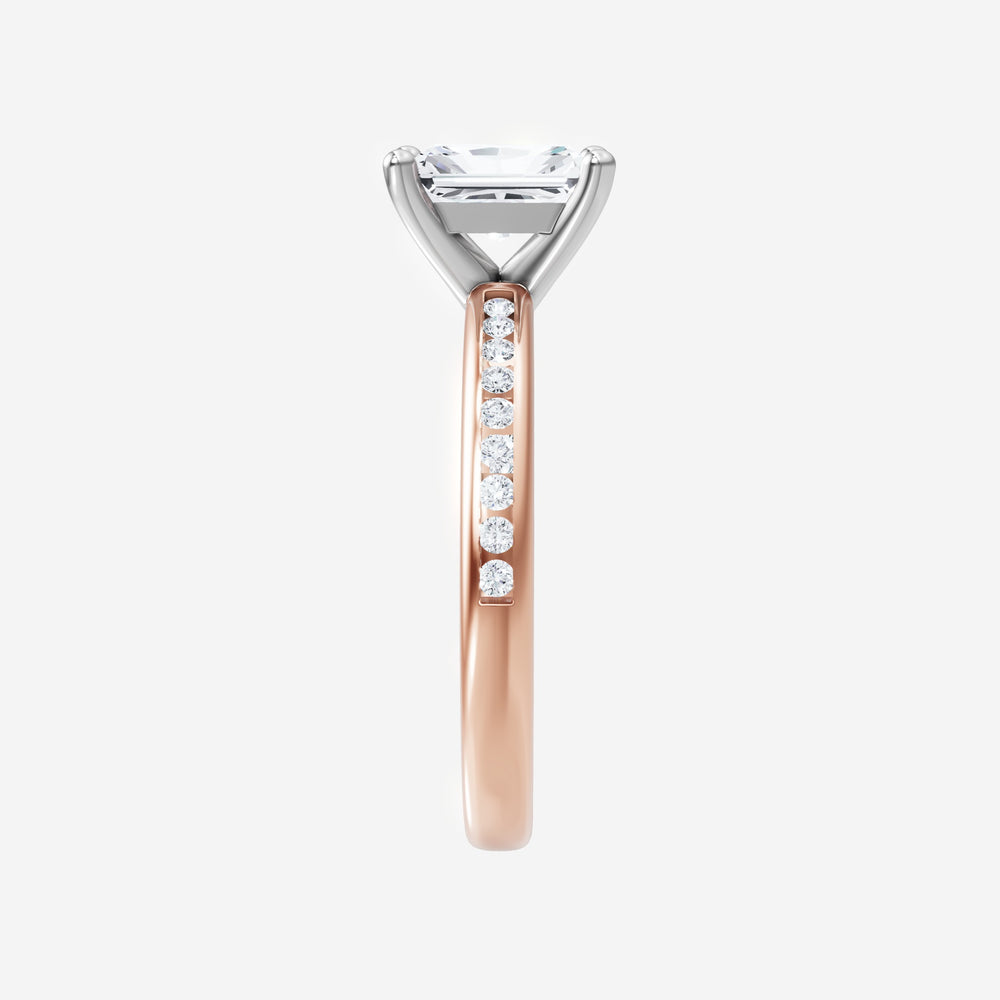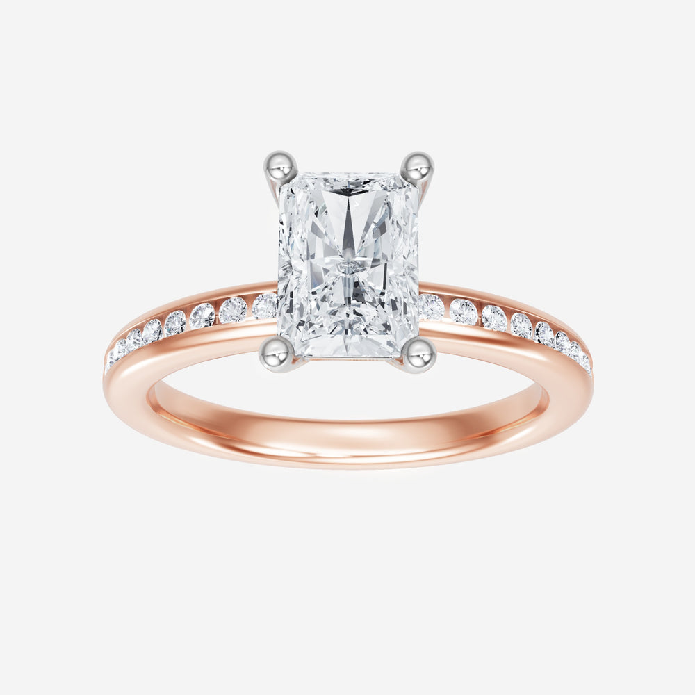 You’ve designed a ring that reflects lasting elegance and grace! Crafted from 14k Rose White Dual Tone, this exquisite Radiant lab-grown diamond is the centerpiece of this unique design. This Channel Set Shank with a 4 Prong Head head showcases the brilliance of the Radiant diamond, creating a timeless look. Ideal for those who seek both beauty and meaning, this ring will stand as a testament to cherished memories.