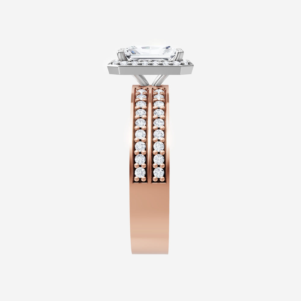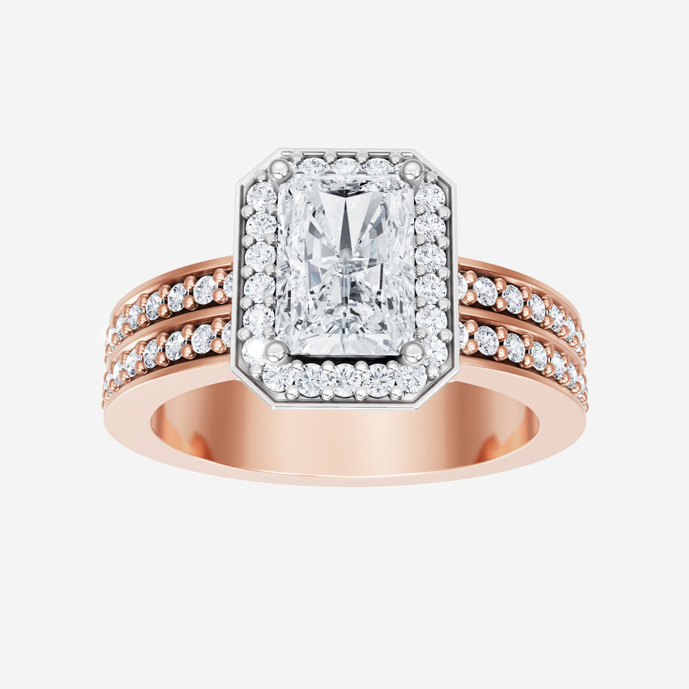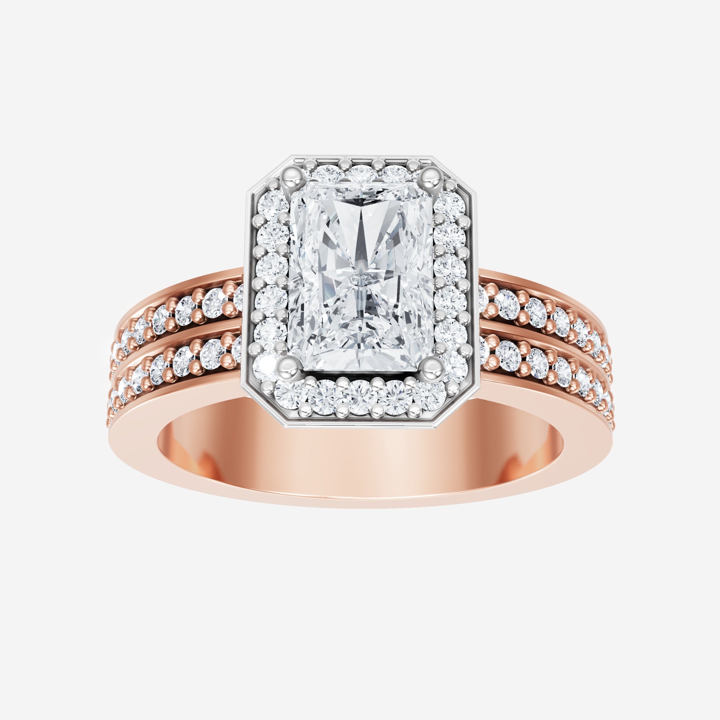 You’ve designed a ring that reflects lasting elegance and grace! Crafted from 14k Rose White Dual Tone, this exquisite Radiant lab-grown diamond is the centerpiece of this unique design. This Double Row Pave with a Pave Halo head showcases the brilliance of the Radiant diamond, creating a timeless look. A perfect choice to celebrate love, commitment, and everything in between.