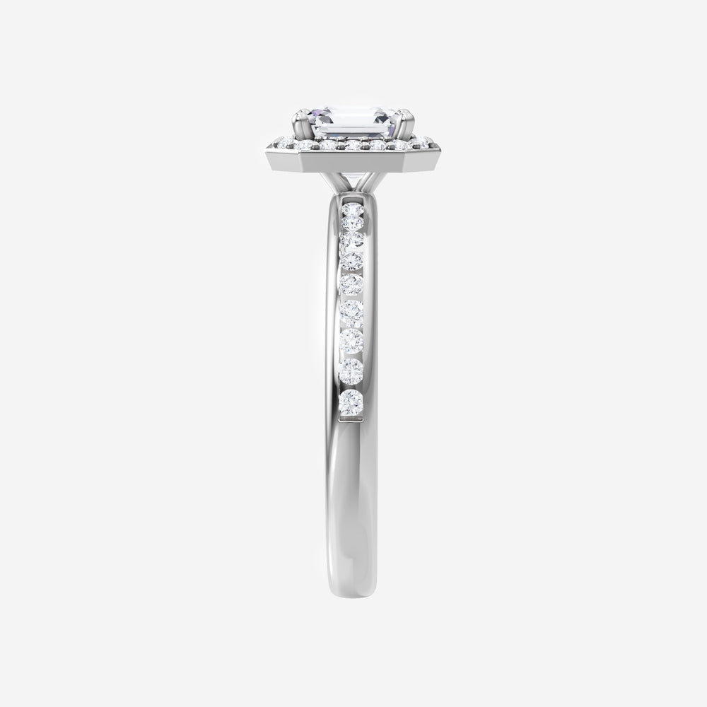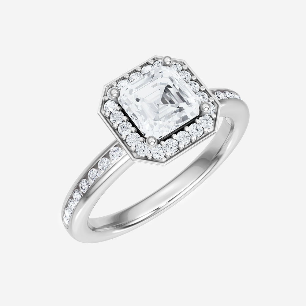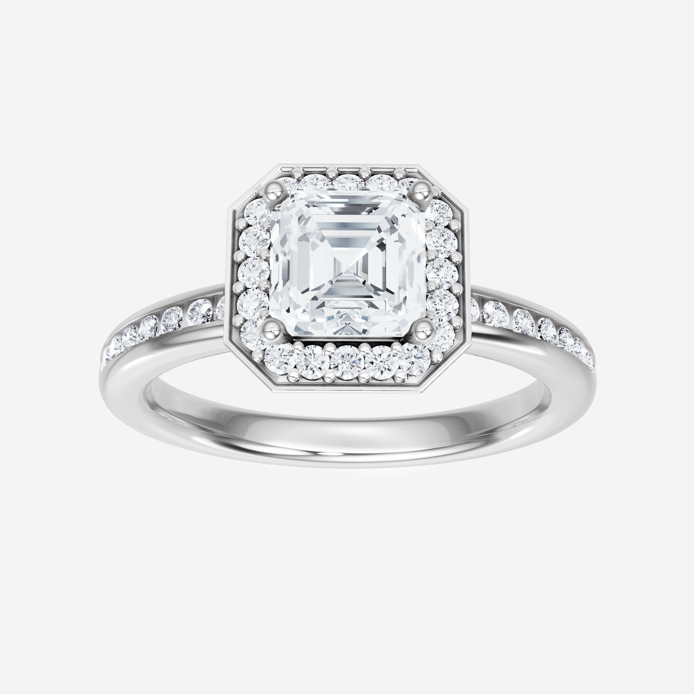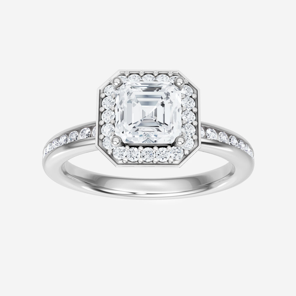 You’ve designed a ring that reflects lasting elegance and grace! Crafted from 14k White Gold, this exquisite Asscher lab-grown diamond is the centerpiece of this unique design. This Channel Set Shank with a Pave Halo head showcases the brilliance of the Asscher diamond, creating a timeless look. Whether as a gift or a personal treasure, this ring will forever symbolize the most meaningful moments in life.
