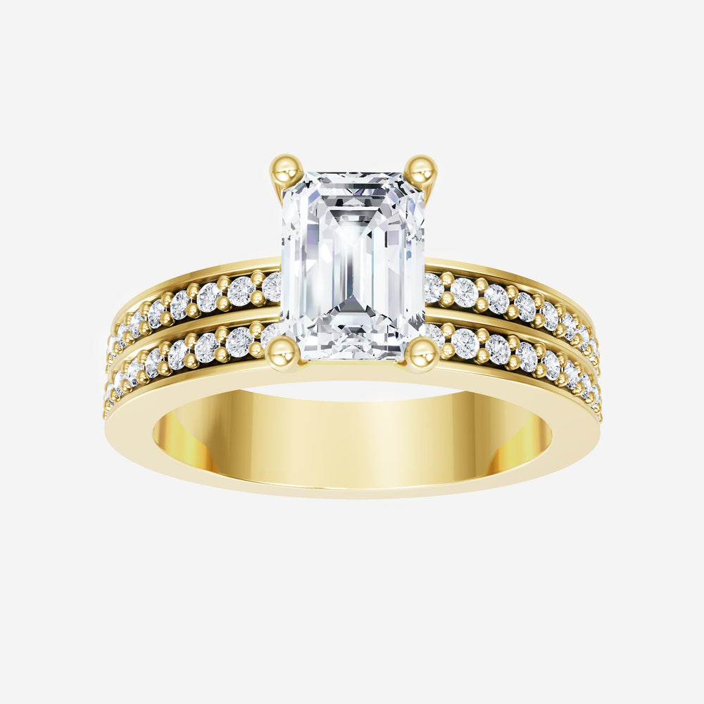 You’ve designed a ring that reflects lasting elegance and grace! Crafted from 14k Yellow Gold, this exquisite Emerald lab-grown diamond is the centerpiece of this unique design. This Double Row Pave with a 4 Prong Head head showcases the brilliance of the Emerald diamond, creating a timeless look. It's a piece of elegance and beauty, perfect for marking life's most beautiful occasions.