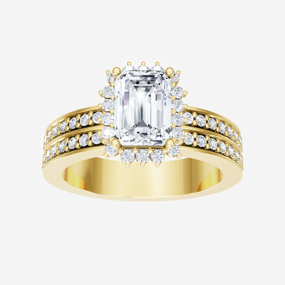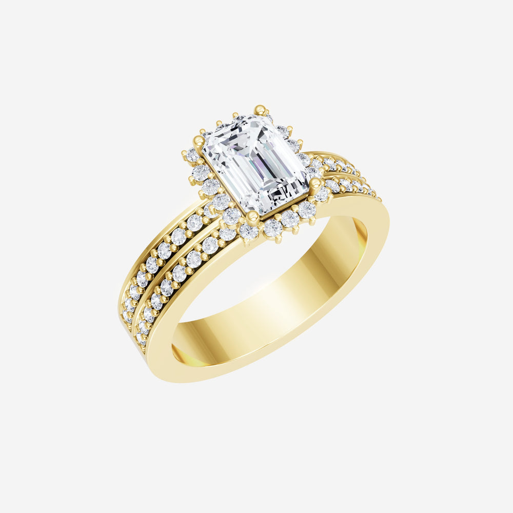 You’ve designed a ring that reflects lasting elegance and grace! Crafted from 14k Yellow Gold, this exquisite Emerald lab-grown diamond is the centerpiece of this unique design. This Double Row Pave with a Diana Halo head showcases the brilliance of the Emerald diamond, creating a timeless look. It's a piece of elegance and beauty, perfect for marking life's most beautiful occasions.