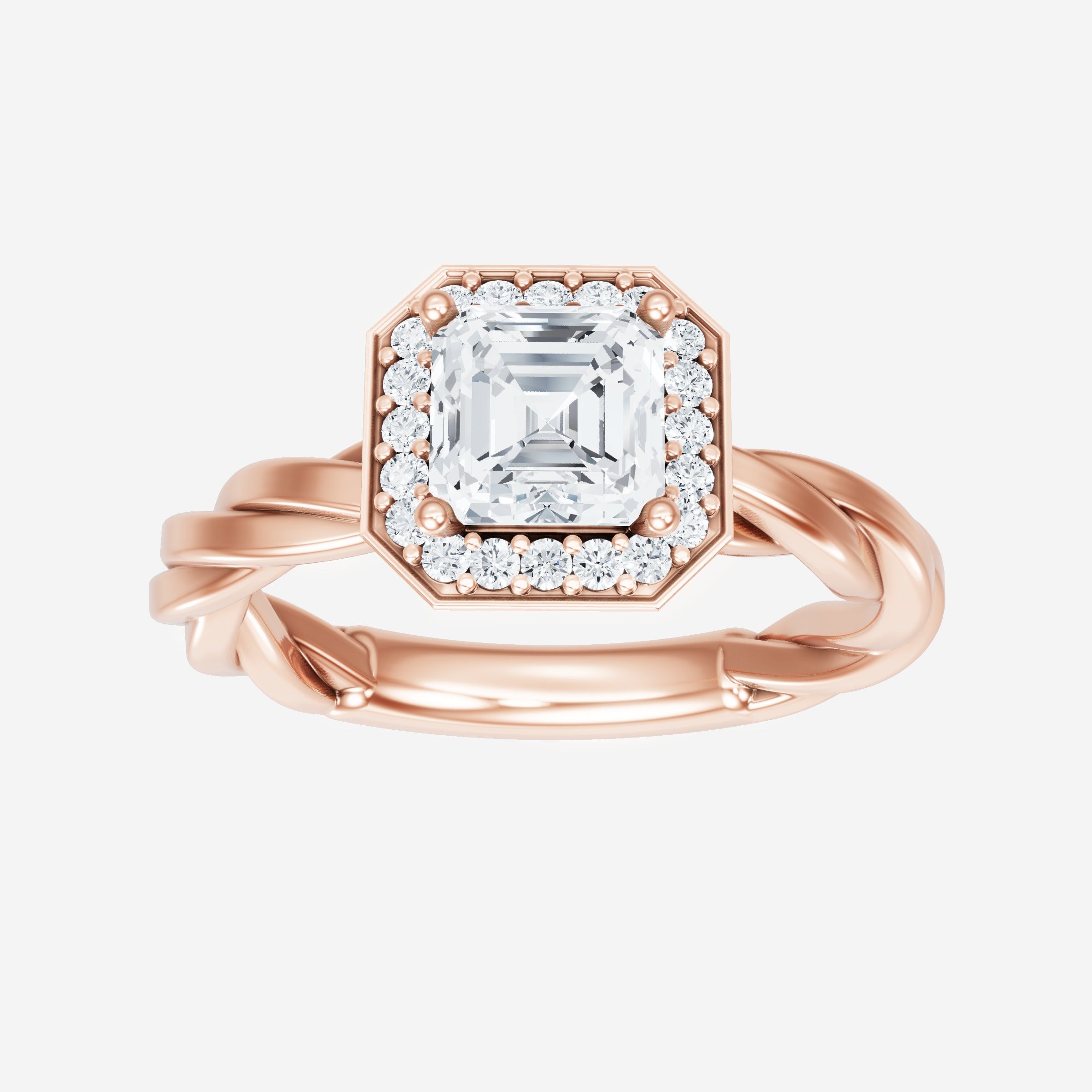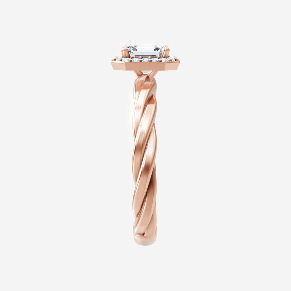 You’ve designed a ring that reflects lasting elegance and grace! Crafted from 18k Rose Gold, this exquisite Asscher lab-grown diamond is the centerpiece of this unique design. This Rope Plain Shank with a Pave Halo head showcases the brilliance of the Asscher diamond, creating a timeless look. This elegant piece is the perfect symbol of love, strength, and timeless beauty.