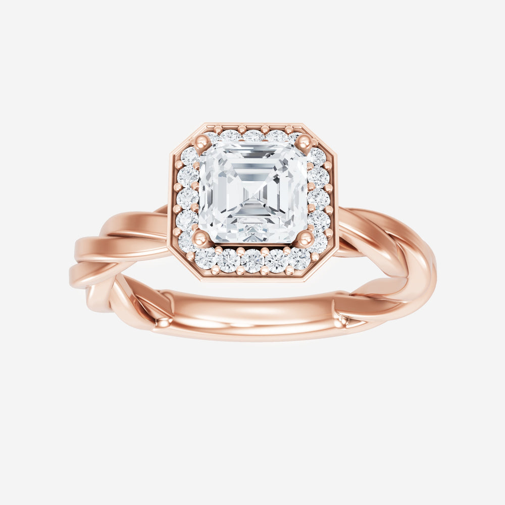 You’ve designed a ring that reflects lasting elegance and grace! Crafted from 18k Rose Gold, this exquisite Asscher lab-grown diamond is the centerpiece of this unique design. This Rope Plain Shank with a Pave Halo head showcases the brilliance of the Asscher diamond, creating a timeless look. This elegant piece is the perfect symbol of love, strength, and timeless beauty.