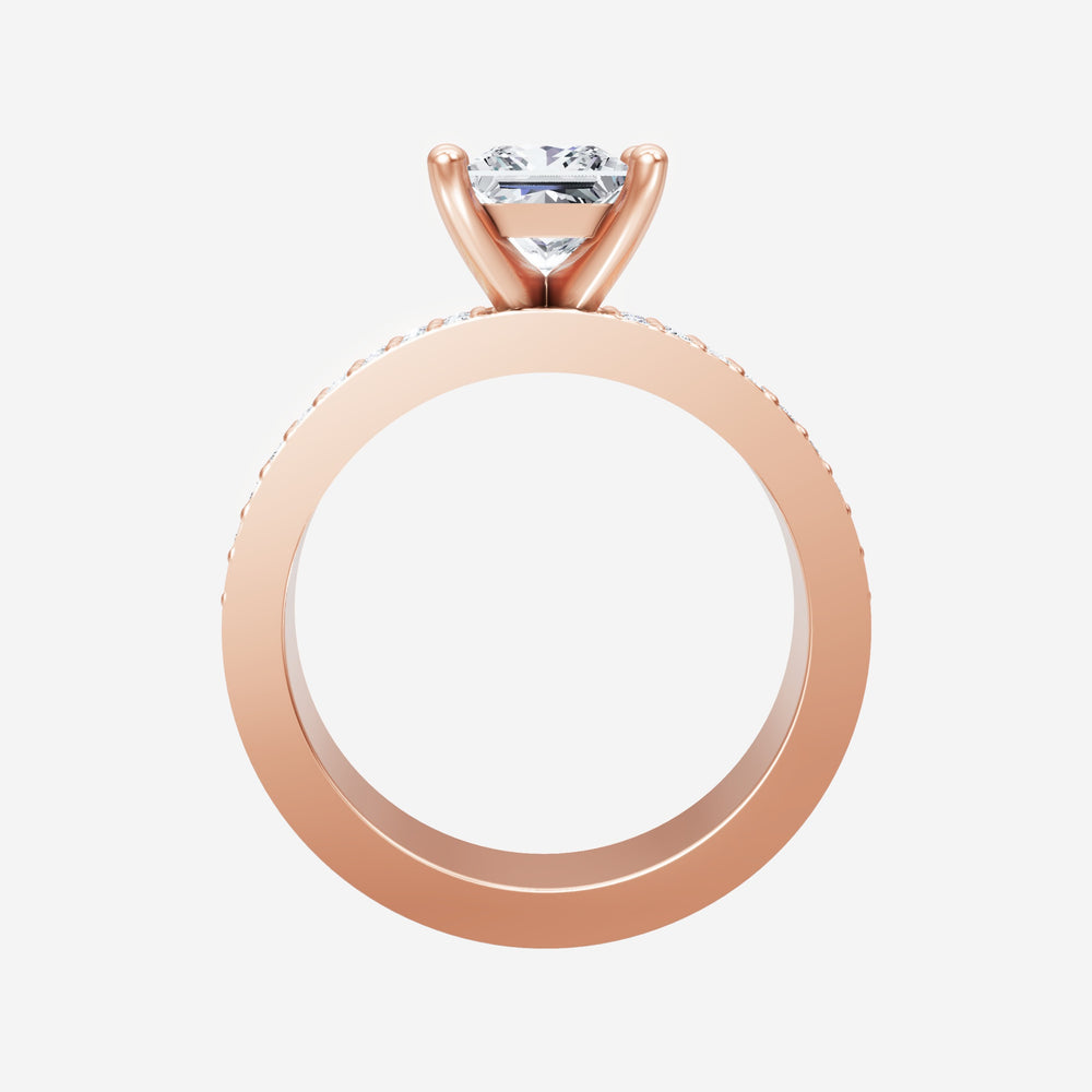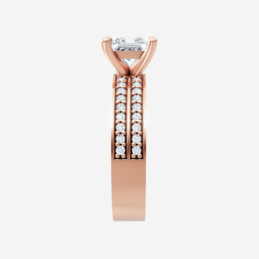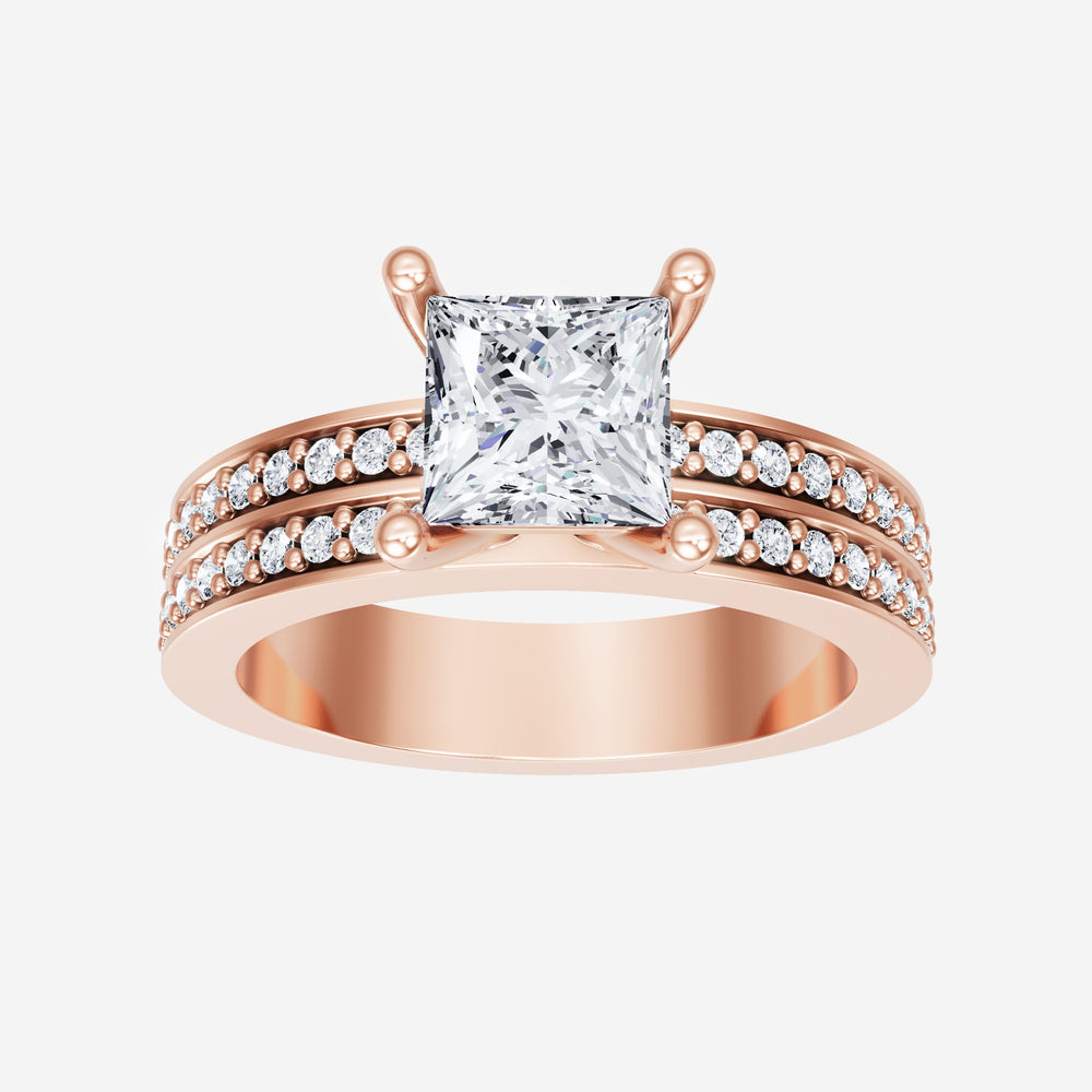 You’ve designed a ring that reflects lasting elegance and grace! Crafted from 18k Rose Gold, this exquisite Princess lab-grown diamond is the centerpiece of this unique design. This Double Row Pave with a 4 Prong Head head showcases the brilliance of the Princess diamond, creating a timeless look. This ring will become a cherished reminder of life's most treasured moments.