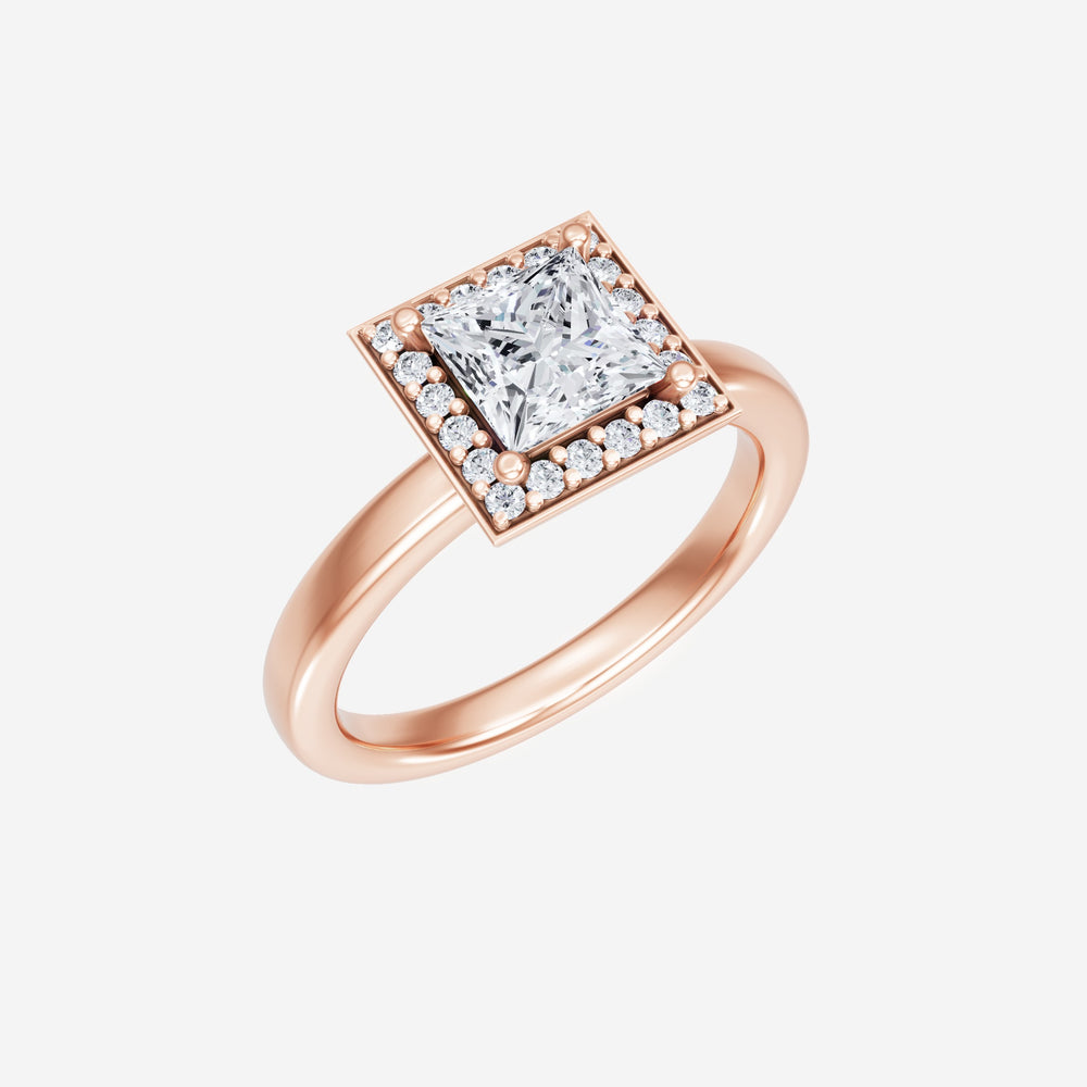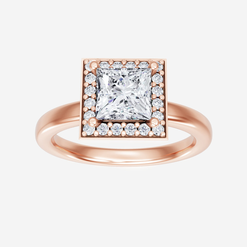 You’ve designed a ring that reflects lasting elegance and grace! Crafted from 18k Rose Gold, this exquisite Princess lab-grown diamond is the centerpiece of this unique design. This Basic Plain Shank with a Pave Halo head showcases the brilliance of the Princess diamond, creating a timeless look. Ideal for those who seek both beauty and meaning, this ring will stand as a testament to cherished memories.