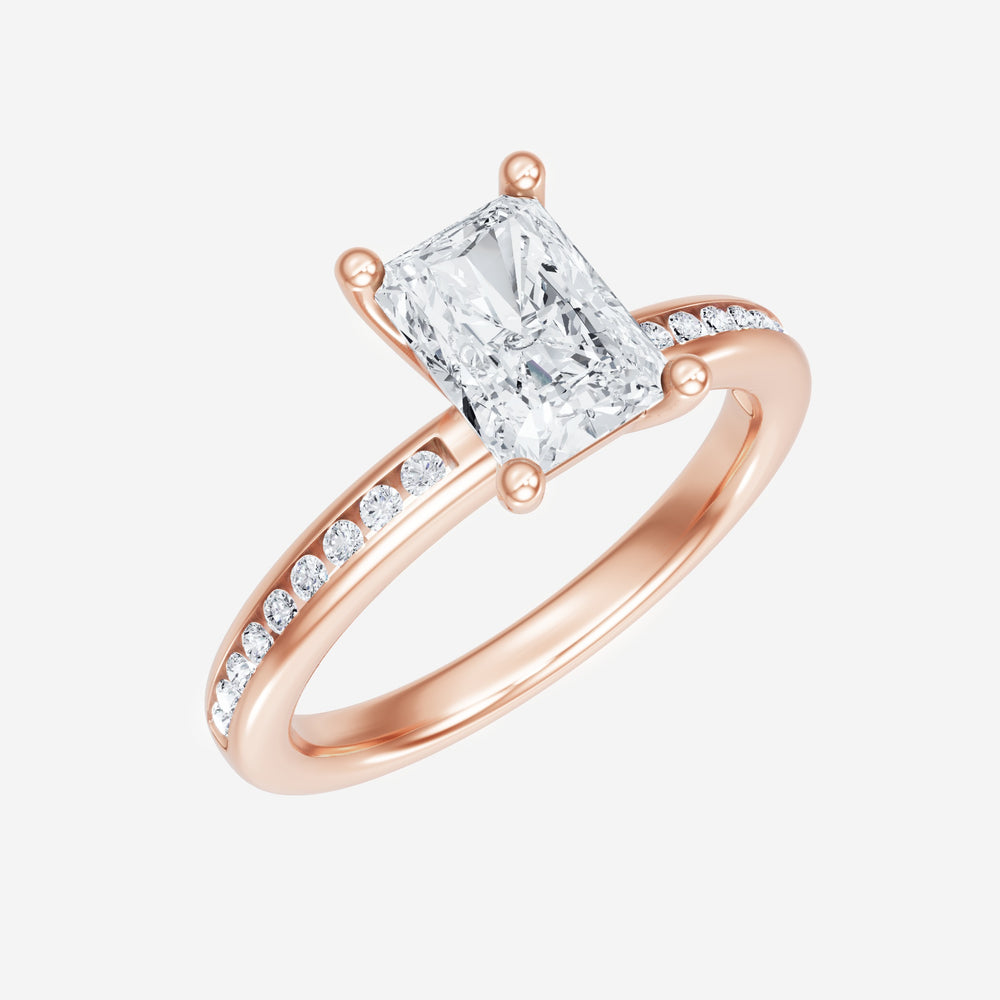 You’ve designed a ring that reflects lasting elegance and grace! Crafted from 18k Rose Gold, this exquisite Radiant lab-grown diamond is the centerpiece of this unique design. This Channel Set Shank with a 4 Prong Head head showcases the brilliance of the Radiant diamond, creating a timeless look. Ideal for those who seek both beauty and meaning, this ring will stand as a testament to cherished memories.