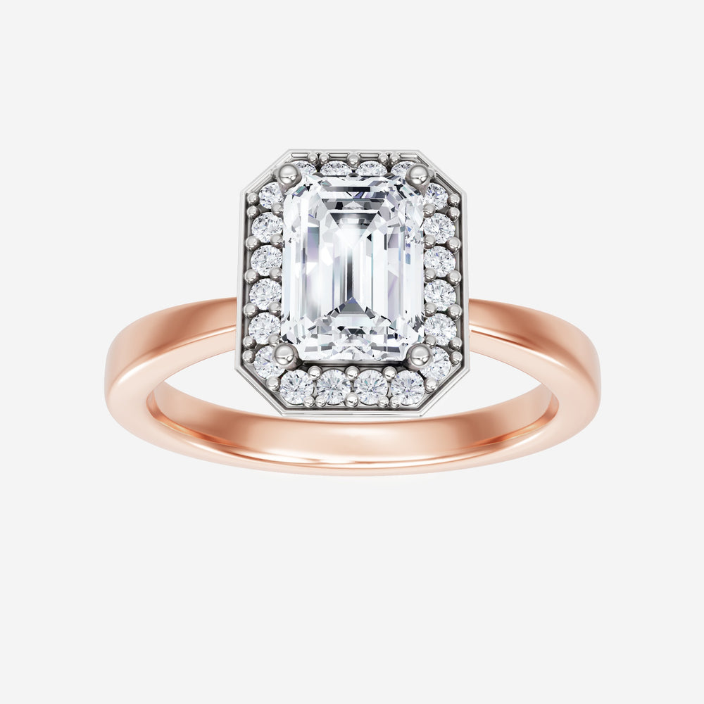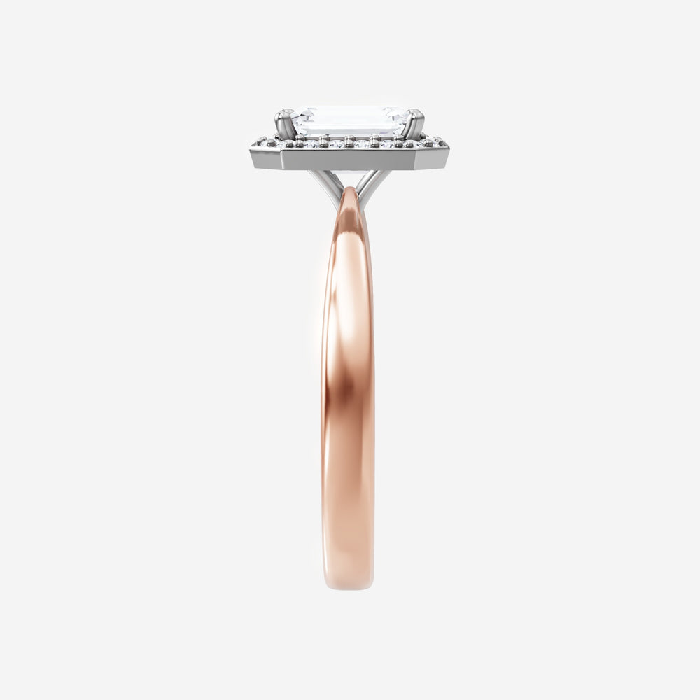 You’ve designed a ring that reflects lasting elegance and grace! Crafted from 18k Rose White Dual Tone, this exquisite Emerald lab-grown diamond is the centerpiece of this unique design. This Bow Shank (Reverse Tapered) with a Pave Halo head showcases the brilliance of the Emerald diamond, creating a timeless look. Ideal for those who seek both beauty and meaning, this ring will stand as a testament to cherished memories.
