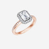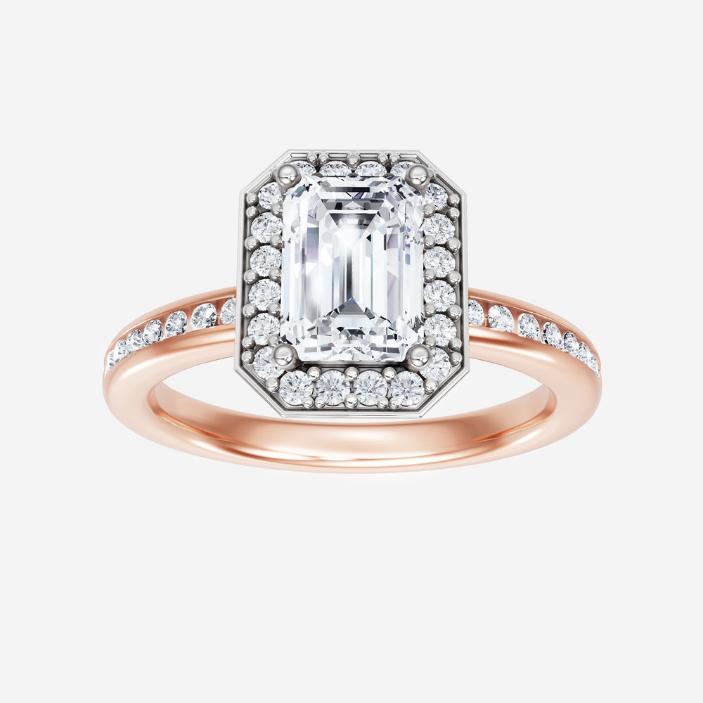 You’ve designed a ring that reflects lasting elegance and grace! Crafted from 18k Rose White Dual Tone, this exquisite Emerald lab-grown diamond is the centerpiece of this unique design. This Channel Set Shank with a Pave Halo head showcases the brilliance of the Emerald diamond, creating a timeless look. This elegant piece is the perfect symbol of love, strength, and timeless beauty.