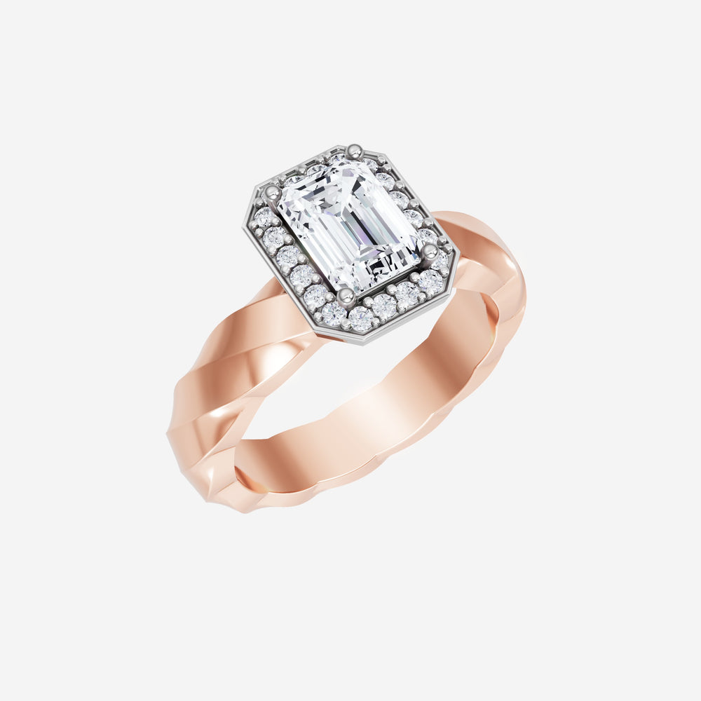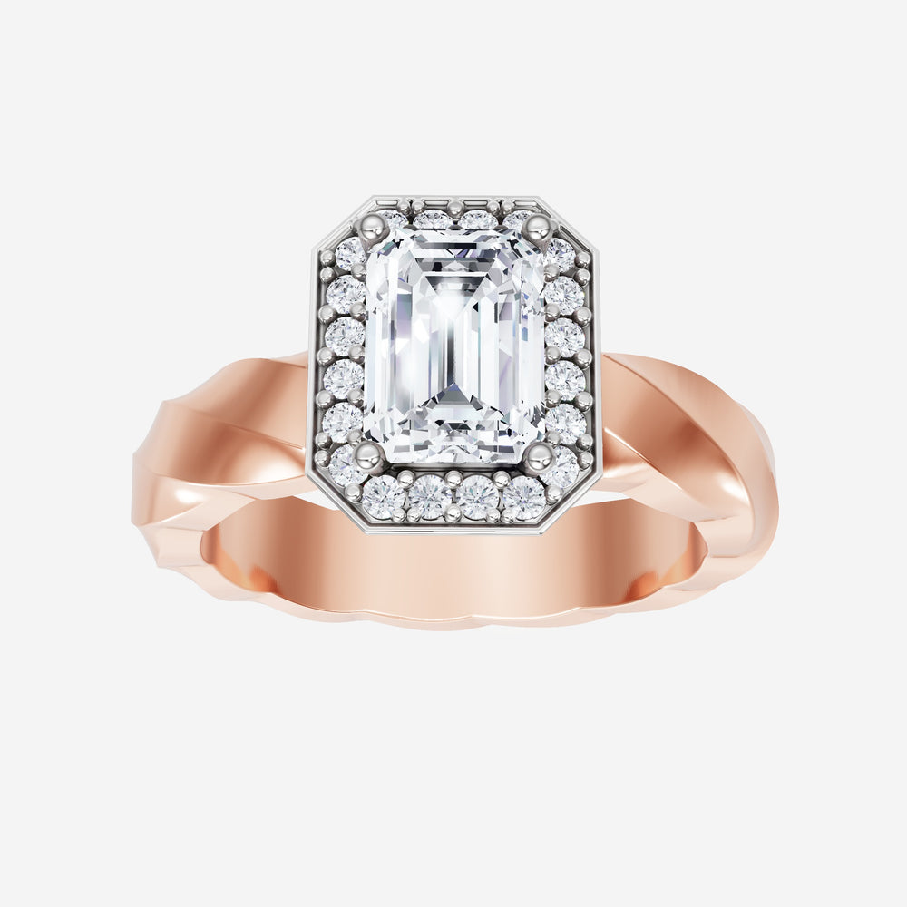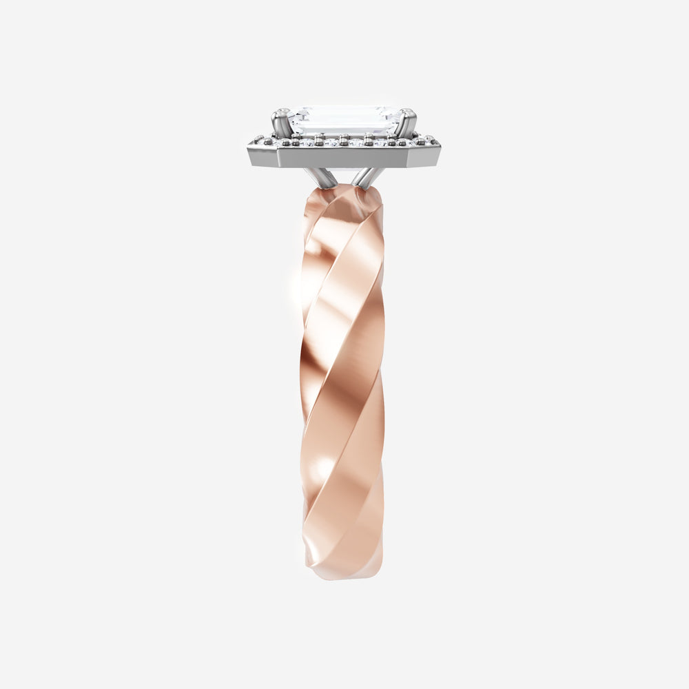 You’ve designed a ring that reflects lasting elegance and grace! Crafted from 18k Rose White Dual Tone, this exquisite Emerald lab-grown diamond is the centerpiece of this unique design. This Twisted Shank with a Pave Halo head showcases the brilliance of the Emerald diamond, creating a timeless look. This stunning ring makes the perfect symbol of everlasting love and devotion.