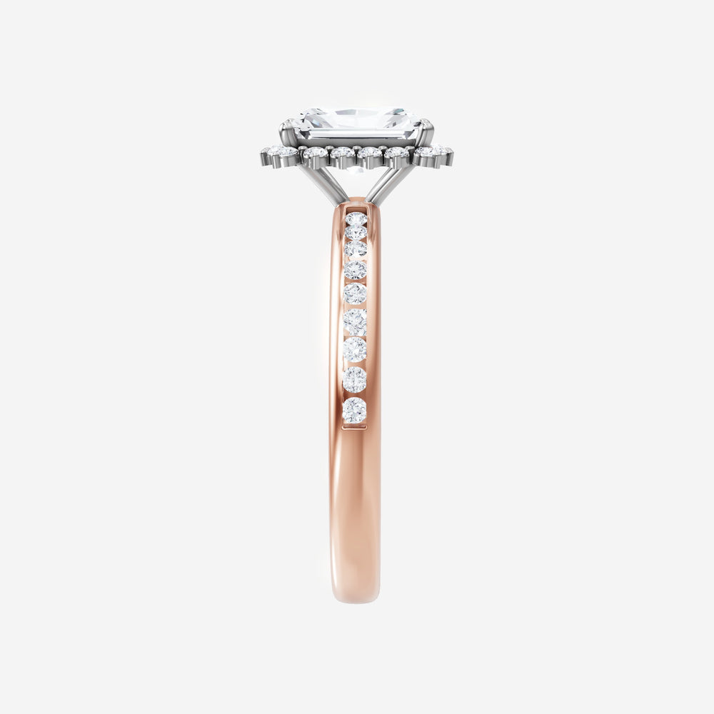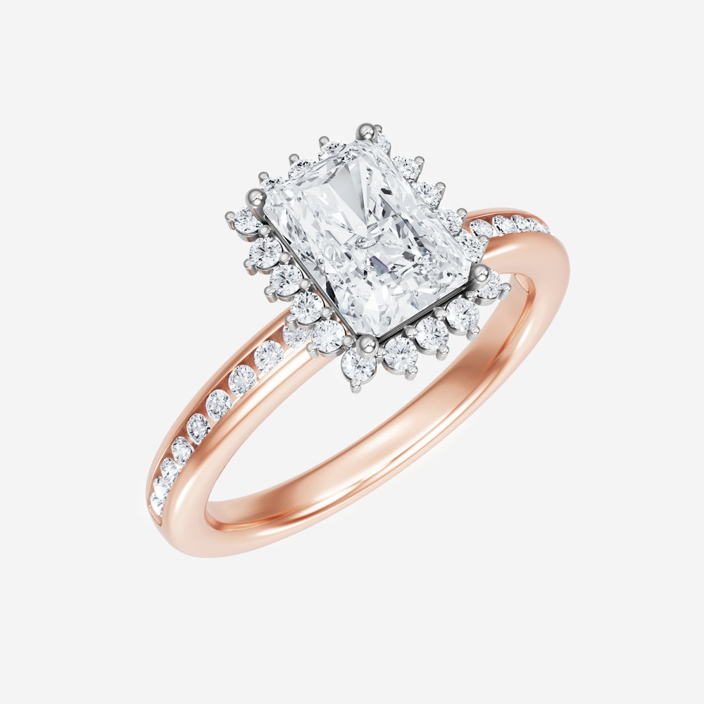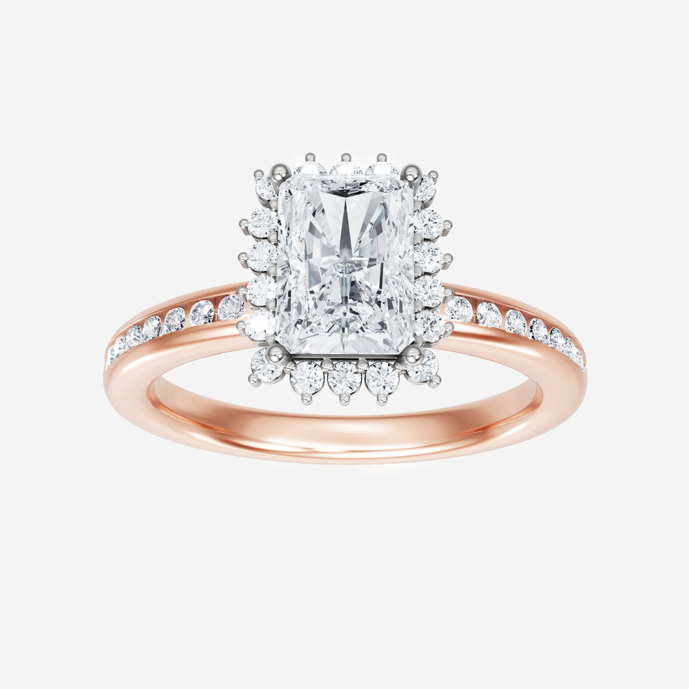 You’ve designed a ring that reflects lasting elegance and grace! Crafted from 18k Rose White Dual Tone, this exquisite Radiant lab-grown diamond is the centerpiece of this unique design. This Channel Set Shank with a Diana Halo head showcases the brilliance of the Radiant diamond, creating a timeless look. A perfect choice to celebrate love, commitment, and everything in between.
