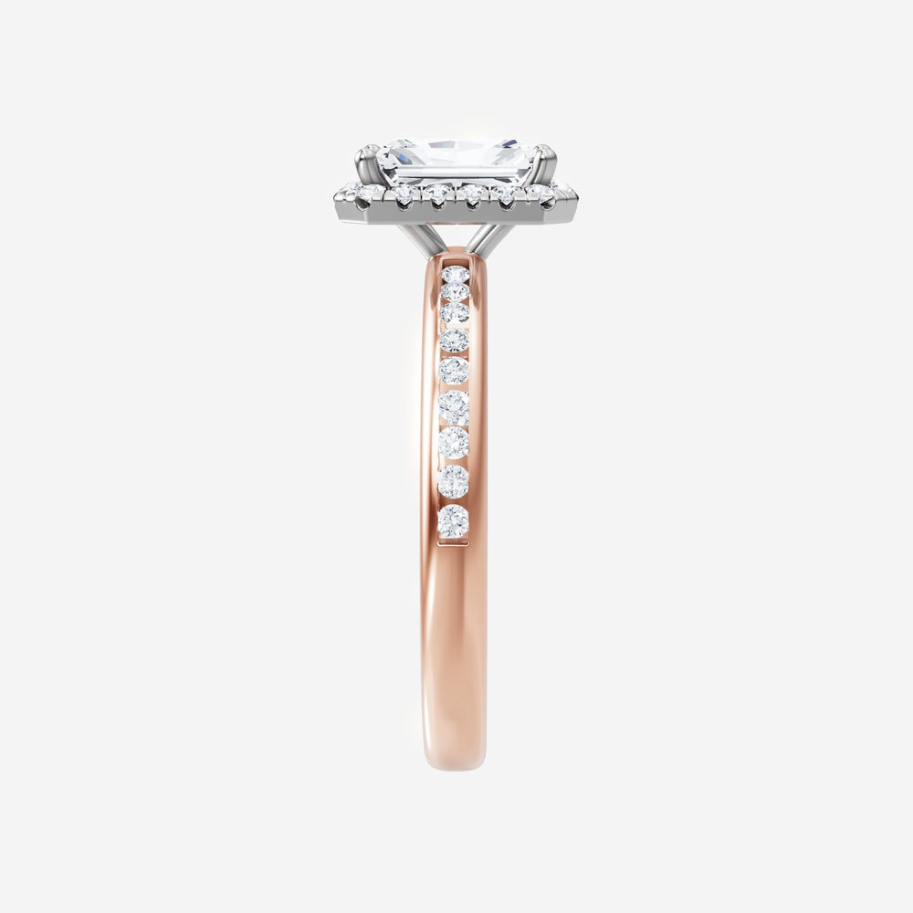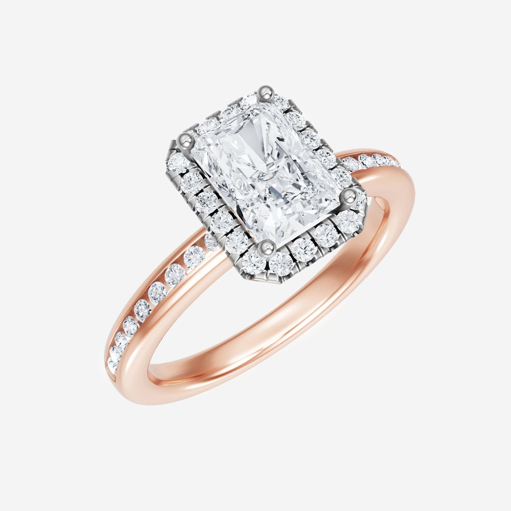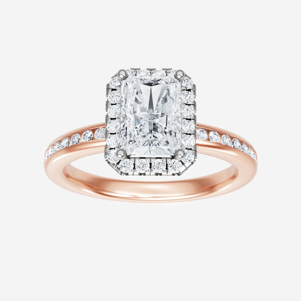 You’ve designed a ring that reflects lasting elegance and grace! Crafted from 18k Rose White Dual Tone, this exquisite Radiant lab-grown diamond is the centerpiece of this unique design. This Channel Set Shank with a Micro Halo head showcases the brilliance of the Radiant diamond, creating a timeless look. Ideal for those who seek both beauty and meaning, this ring will stand as a testament to cherished memories.