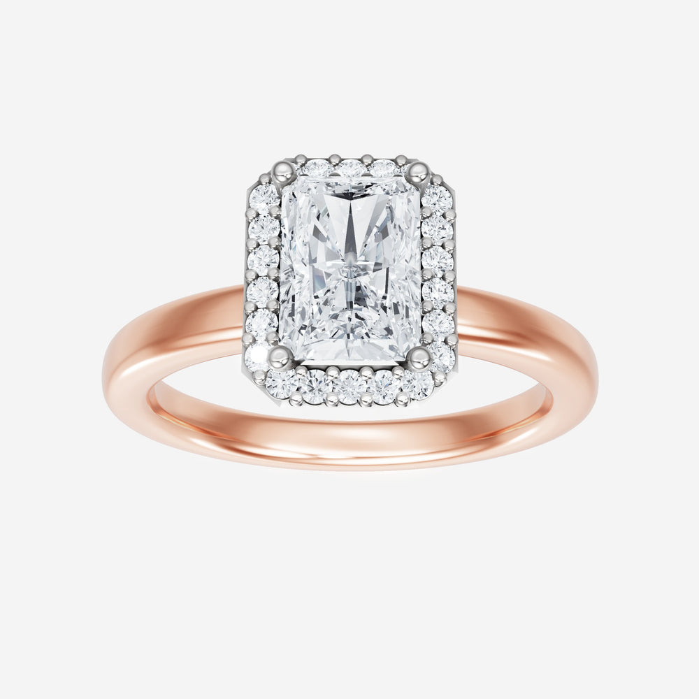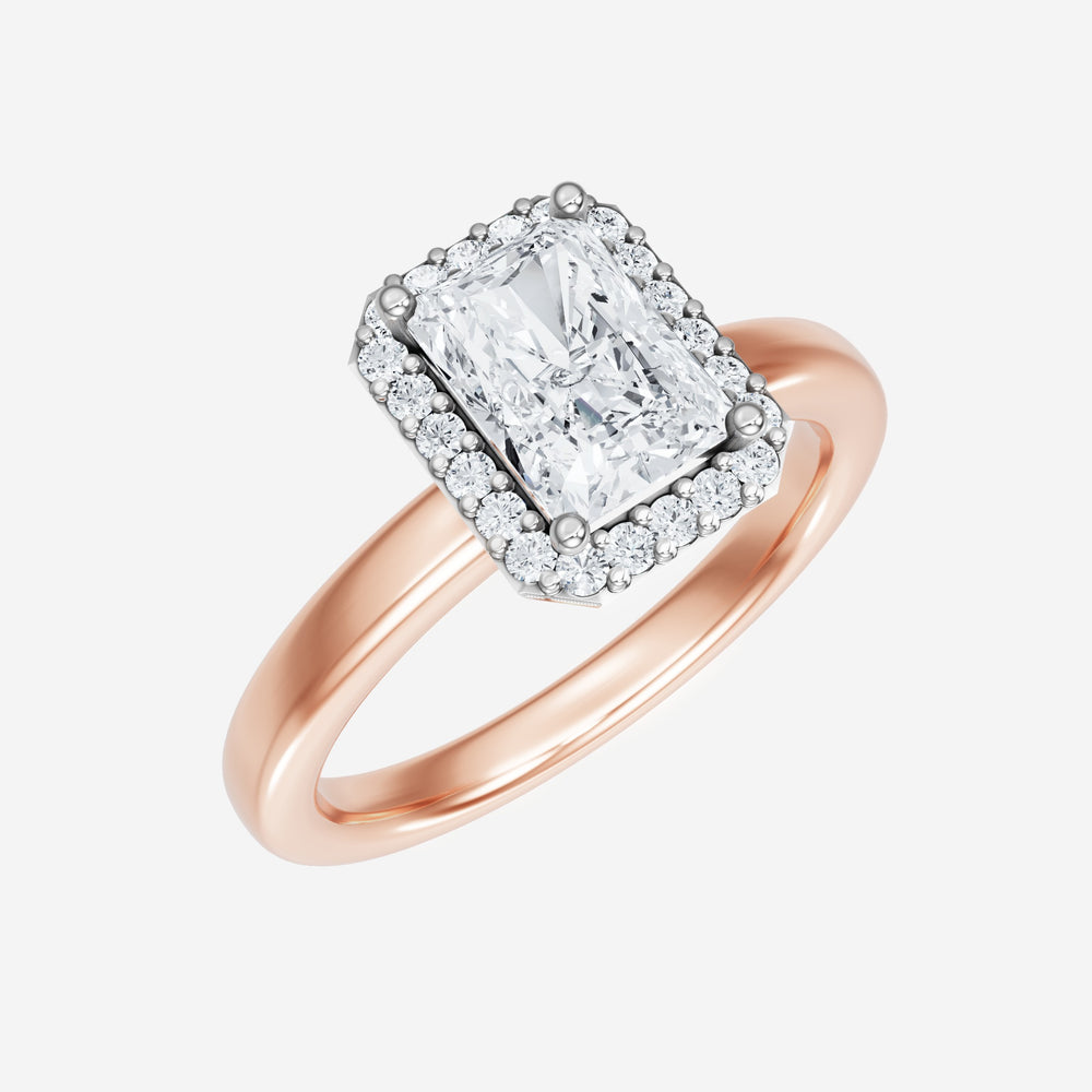 You’ve designed a ring that reflects lasting elegance and grace! Crafted from 18k Rose White Dual Tone, this exquisite Radiant lab-grown diamond is the centerpiece of this unique design. This Basic Plain Shank with a Single Halo head showcases the brilliance of the Radiant diamond, creating a timeless look. This ring will become a cherished reminder of life's most treasured moments.
