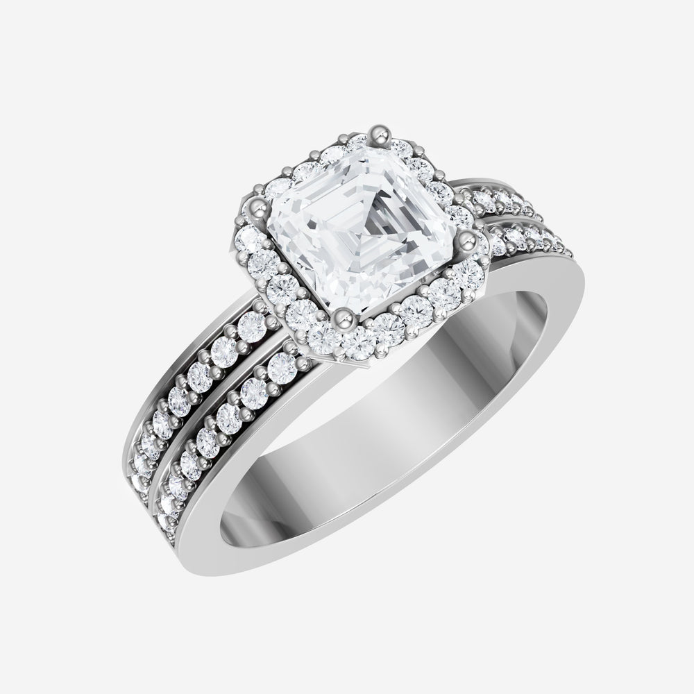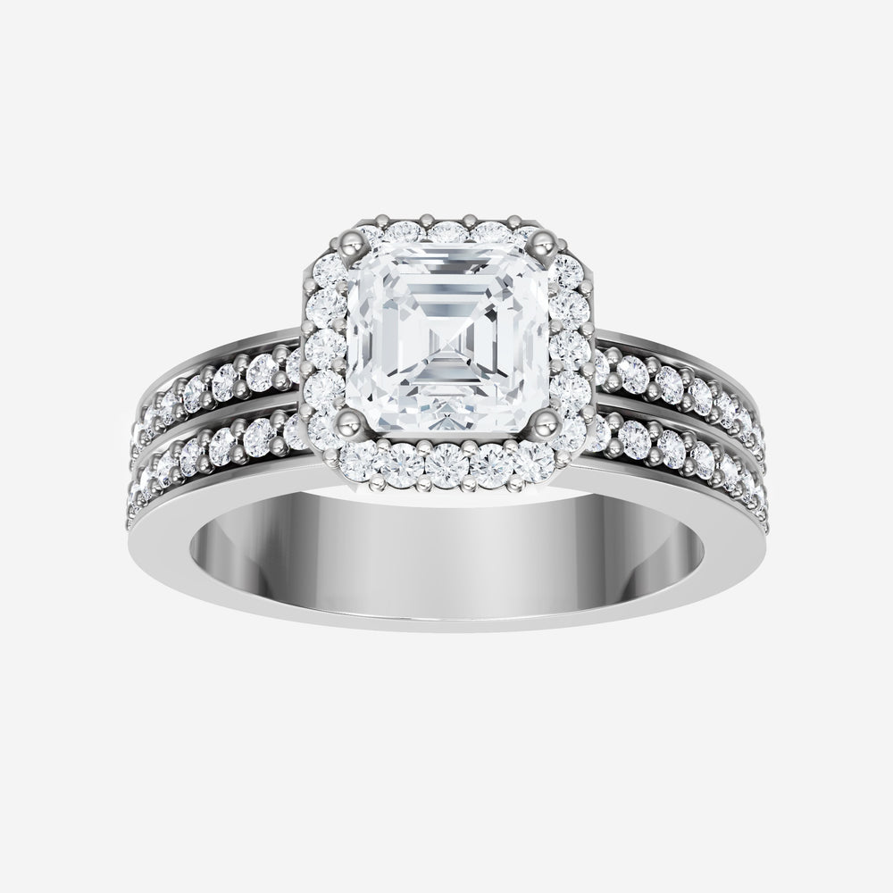 You’ve designed a ring that reflects lasting elegance and grace! Crafted from 18k White Gold, this exquisite Asscher lab-grown diamond is the centerpiece of this unique design. This Double Row Pave with a Single Halo head showcases the brilliance of the Asscher diamond, creating a timeless look. This elegant piece is the perfect symbol of love, strength, and timeless beauty.