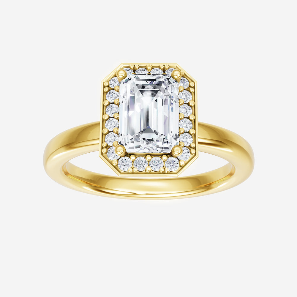 You’ve designed a ring that reflects lasting elegance and grace! Crafted from 18k Yellow Gold, this exquisite Emerald lab-grown diamond is the centerpiece of this unique design. This Basic Plain Shank with a Pave Halo head showcases the brilliance of the Emerald diamond, creating a timeless look. This ring will become a cherished reminder of life's most treasured moments.