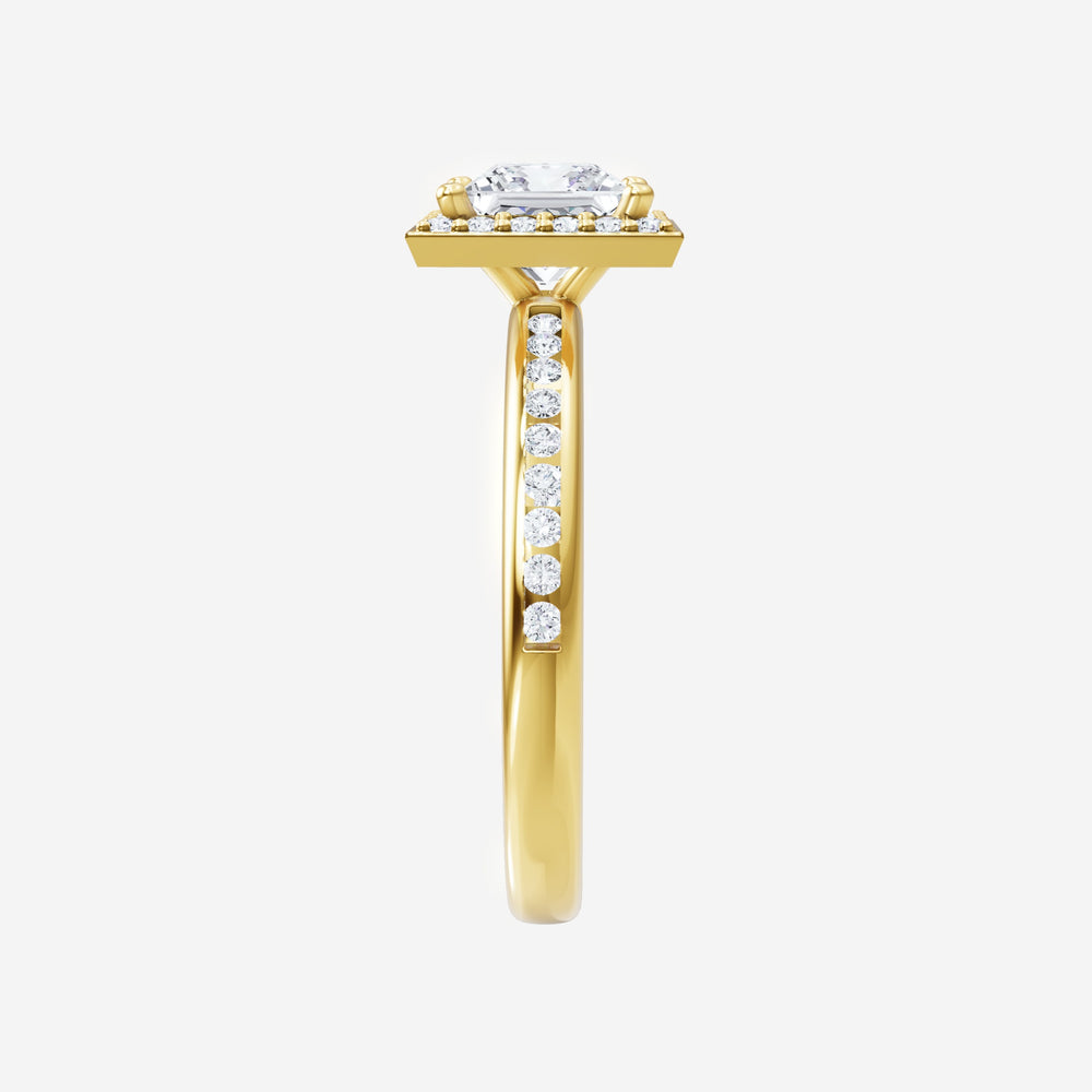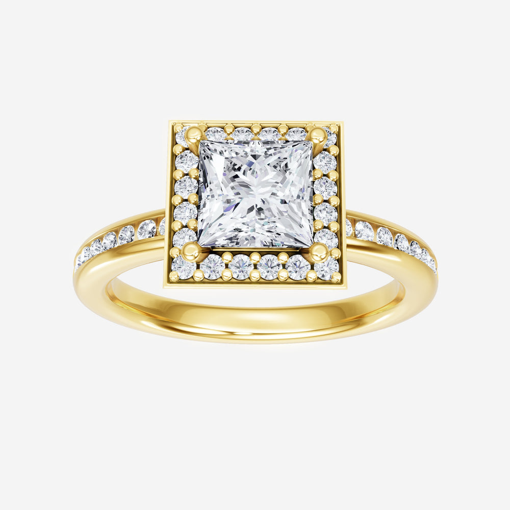 You’ve designed a ring that reflects lasting elegance and grace! Crafted from 18k Yellow Gold, this exquisite Princess lab-grown diamond is the centerpiece of this unique design. This Channel Set Shank with a Pave Halo head showcases the brilliance of the Princess diamond, creating a timeless look. This elegant piece is the perfect symbol of love, strength, and timeless beauty.