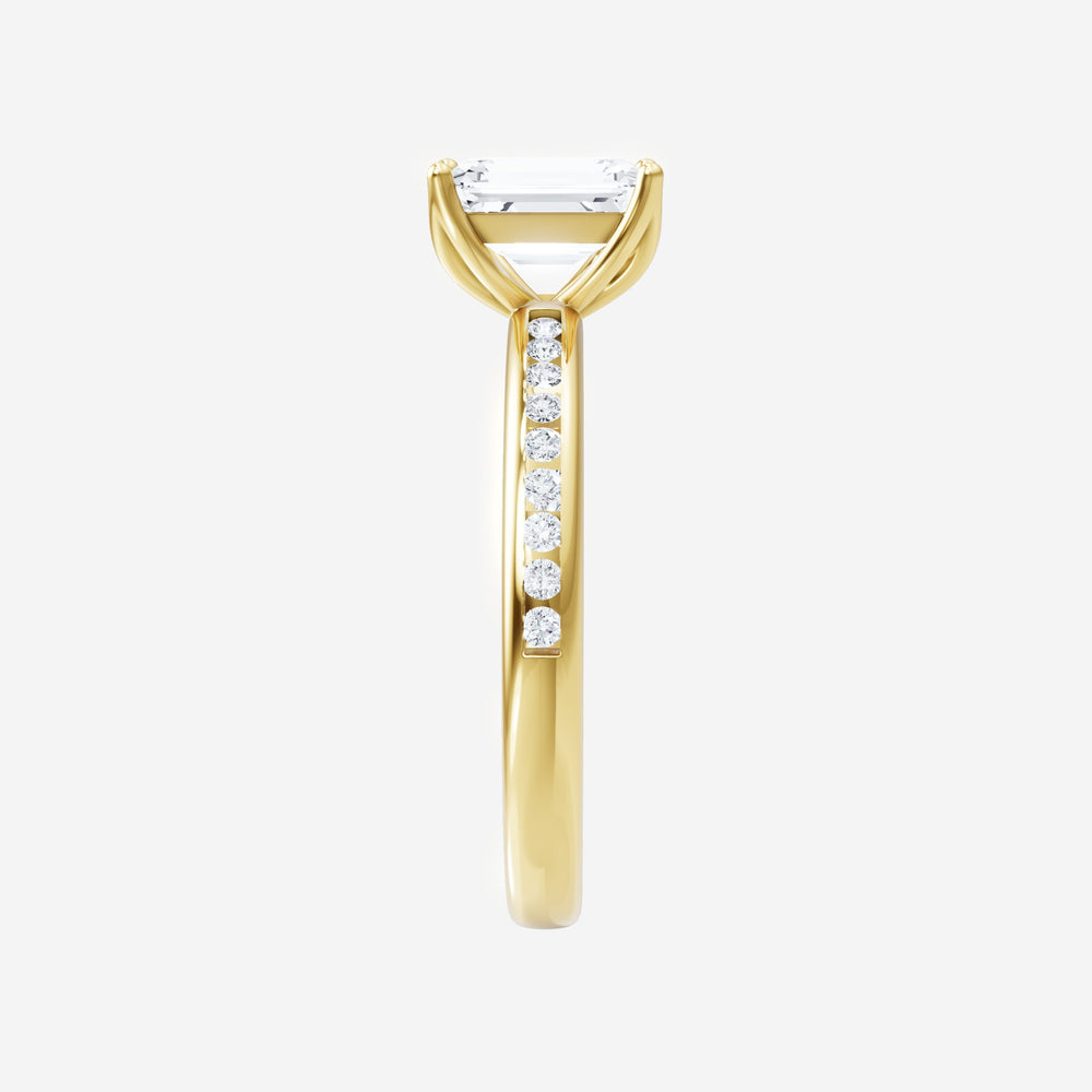 You’ve designed a ring that reflects lasting elegance and grace! Crafted from 14K Yellow Gold, this exquisite Emerald lab-grown diamond is the centerpiece of this unique design. This Channel Set Shank with a 4 Prong Flower Head head showcases the brilliance of the Emerald diamond, creating a timeless look. This elegant piece is the perfect symbol of love, strength, and timeless beauty.
