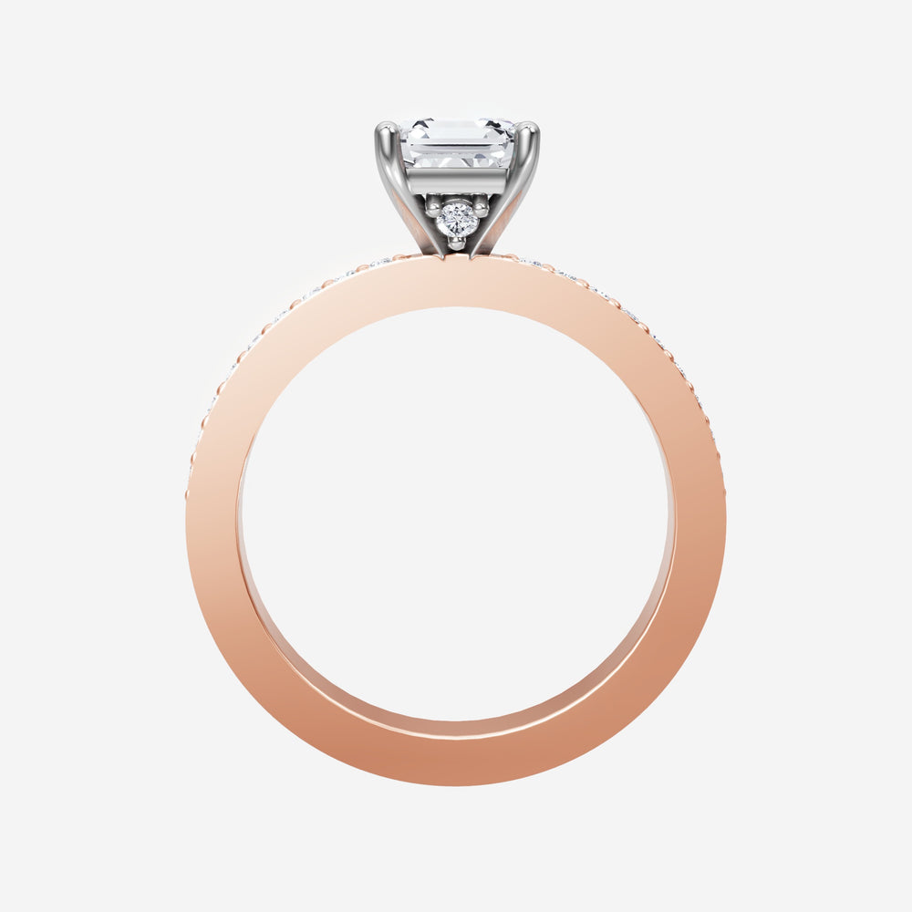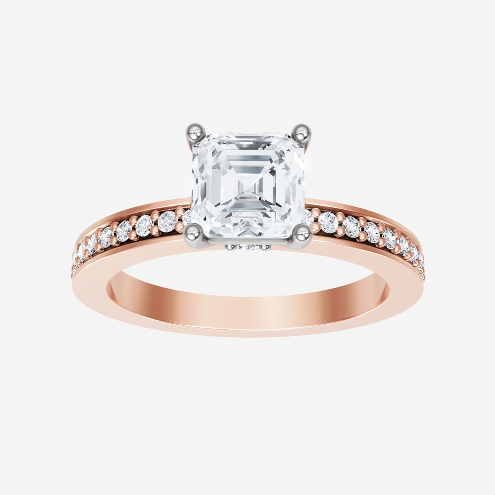You’ve designed a ring that reflects lasting elegance and grace! Crafted from 18k Rose White Dual Tone, this exquisite Asscher lab-grown diamond is the centerpiece of this unique design. This Single Pave Shank with a 4 Prong With Hidden 2 Stone head showcases the brilliance of the Asscher diamond, creating a timeless look. This elegant piece is the perfect symbol of love, strength, and timeless beauty.