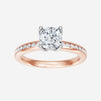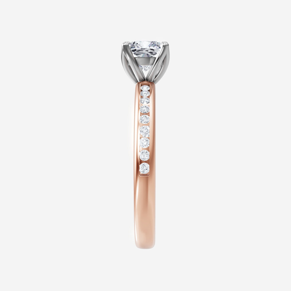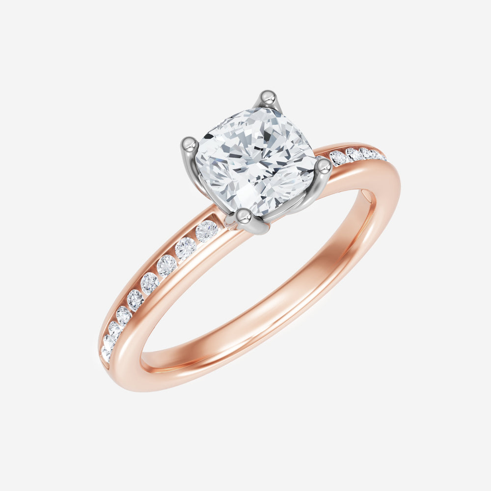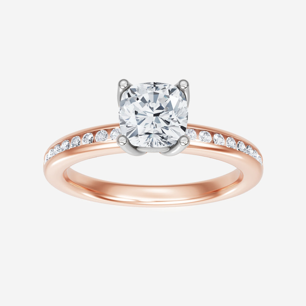 You’ve designed a ring that reflects lasting elegance and grace! Crafted from 18k Rose White Dual Tone, this exquisite Cushion lab-grown diamond is the centerpiece of this unique design. This Channel Set Shank with a 4 Prong Flower Head head showcases the brilliance of the Cushion diamond, creating a timeless look. A perfect choice to celebrate love, commitment, and everything in between.