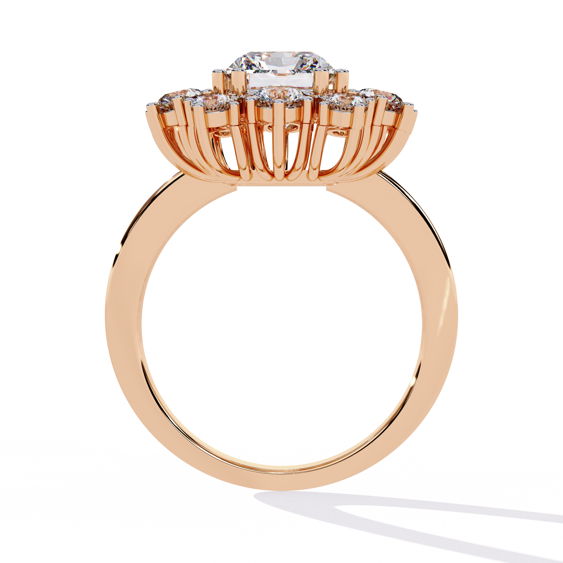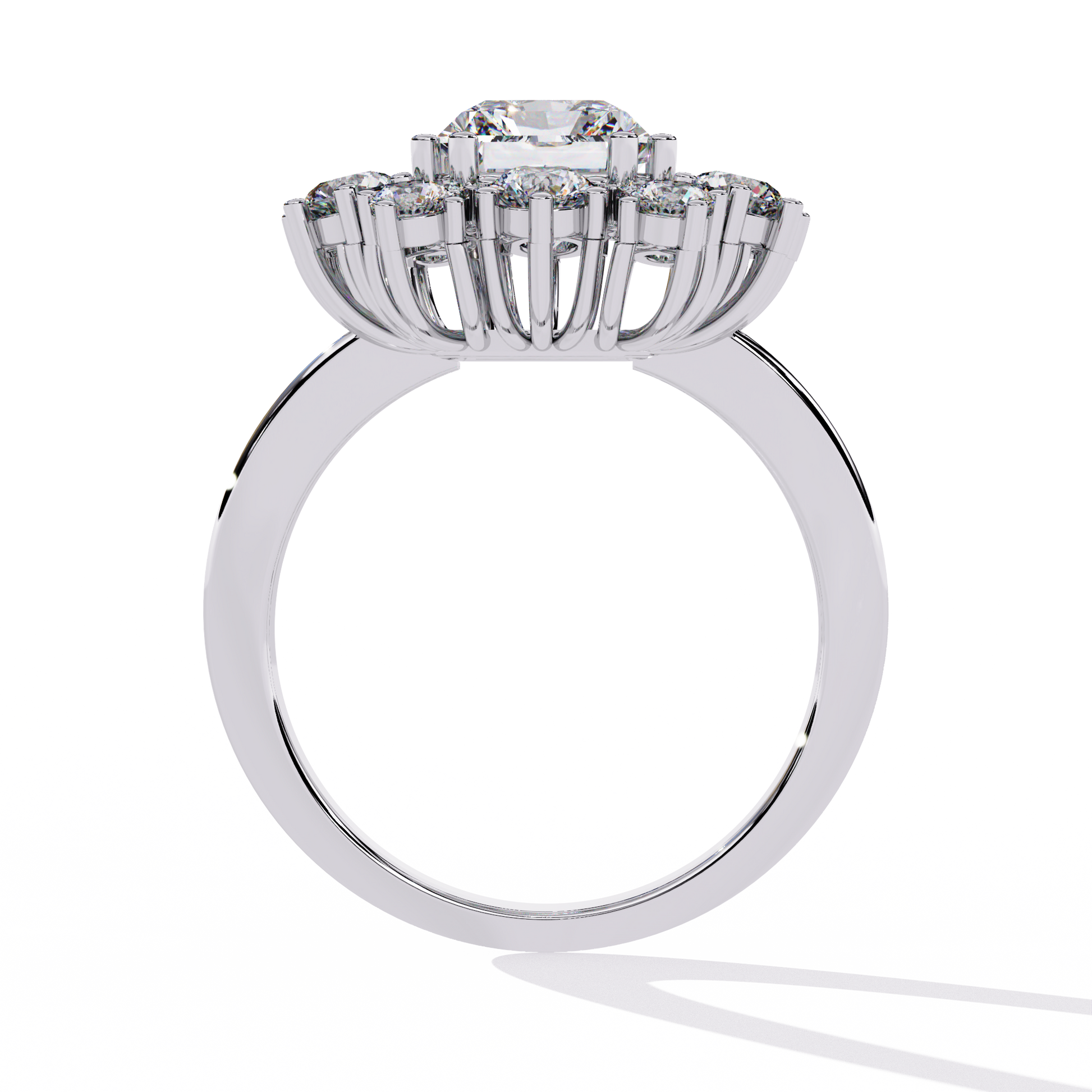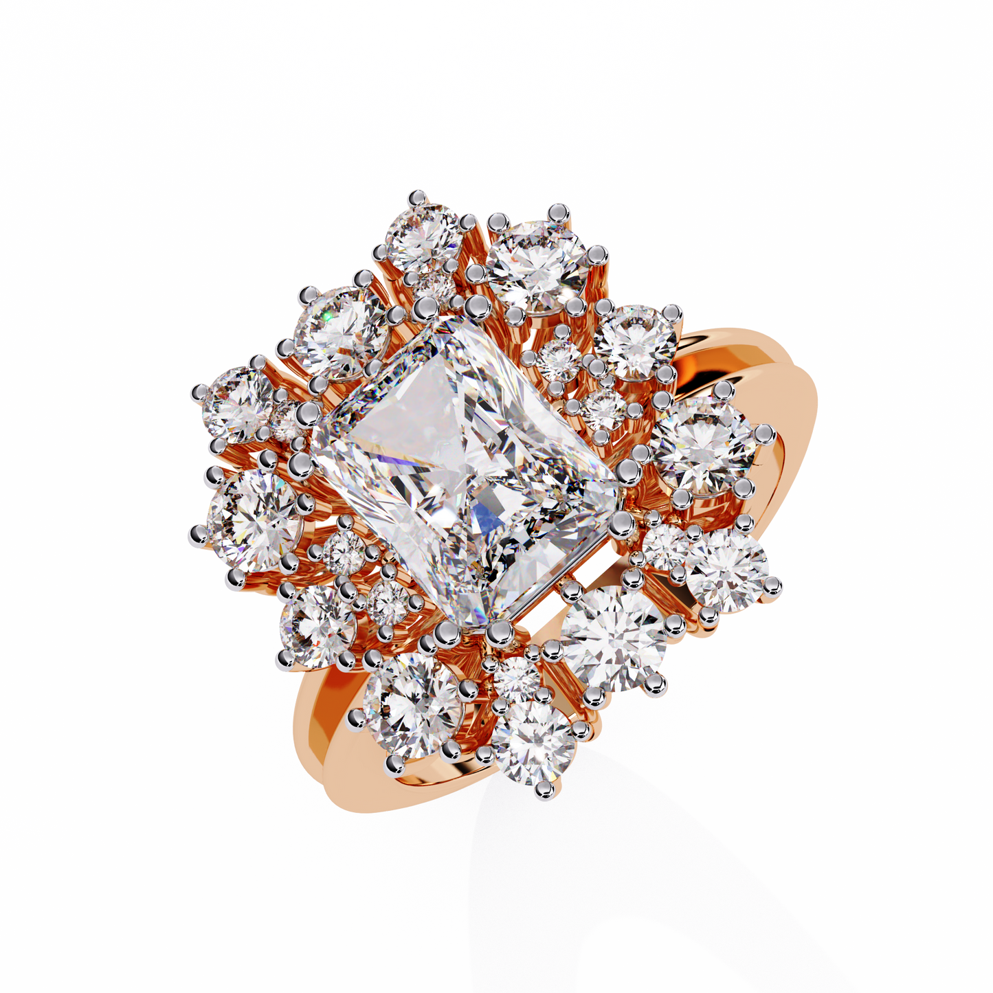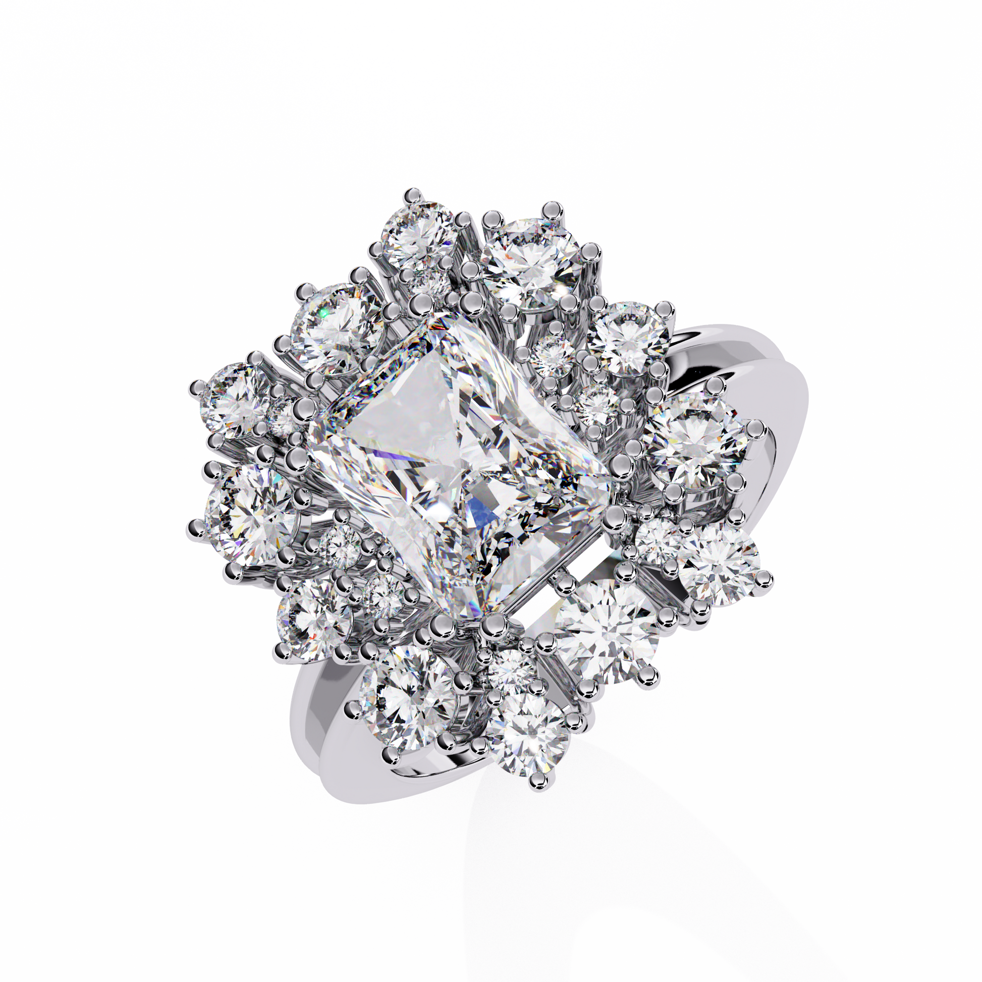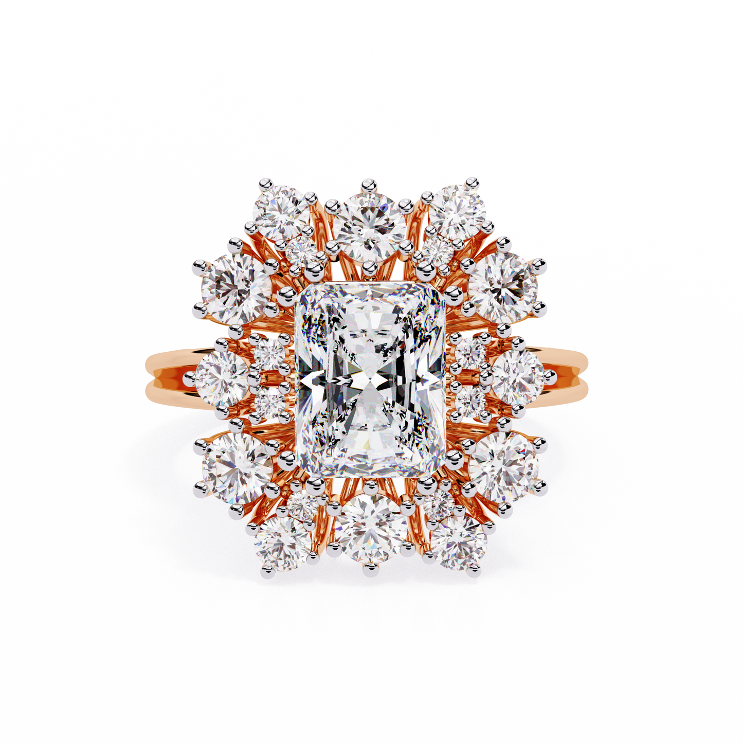 This radiant-cut halo ring is an ideal choice for engagements, anniversaries, or as a striking statement piece, symbolizing grace and grandeur.