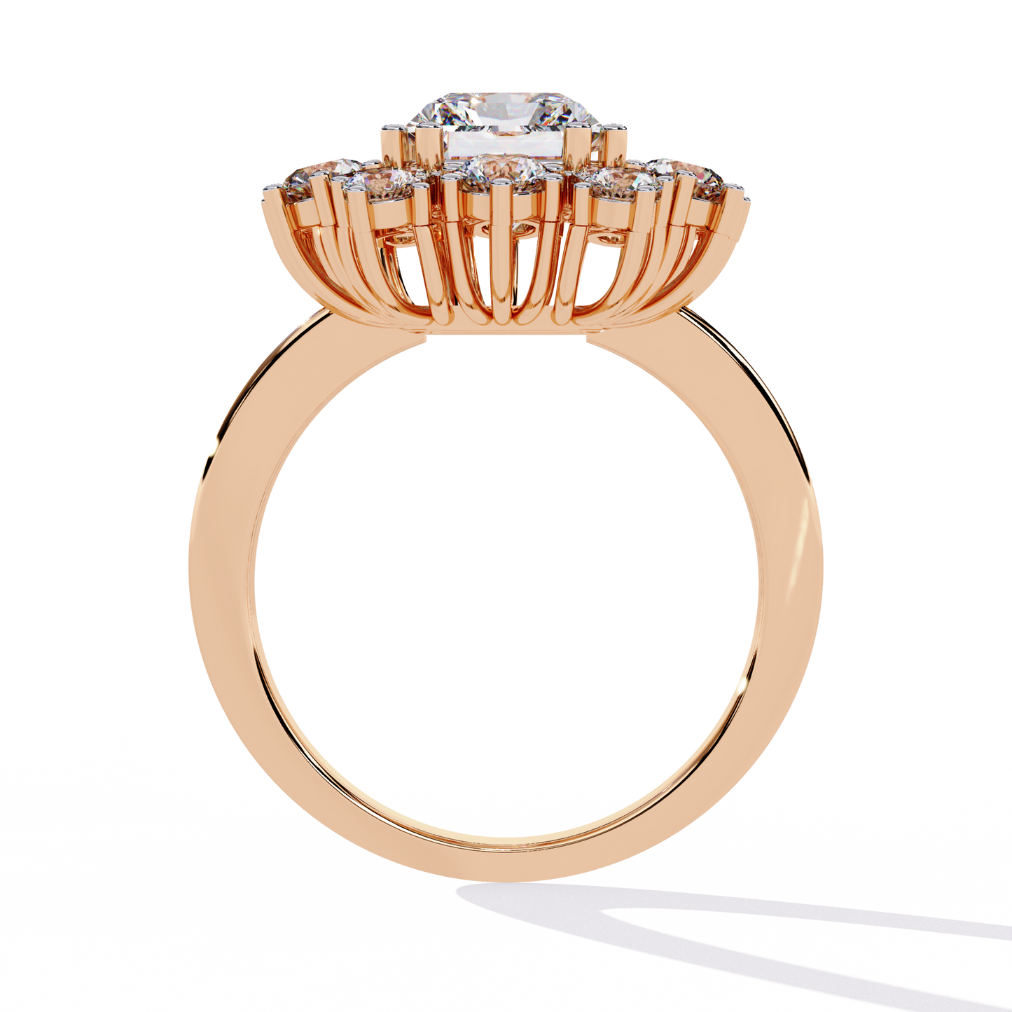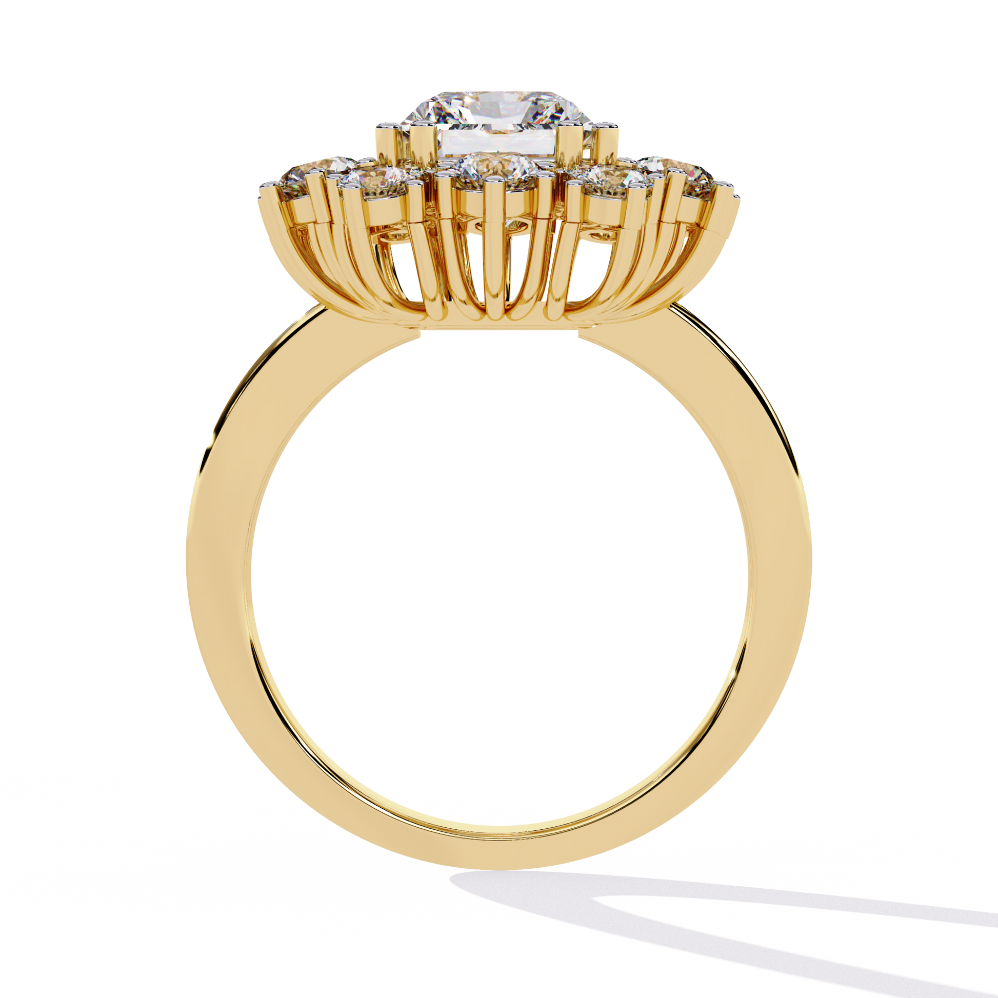 - Design Inspiration: A halo-style setting with a radiant-cut center stone, surrounded by brilliant round-cut diamonds in a sunburst effect, making it a timeless and regal piece.