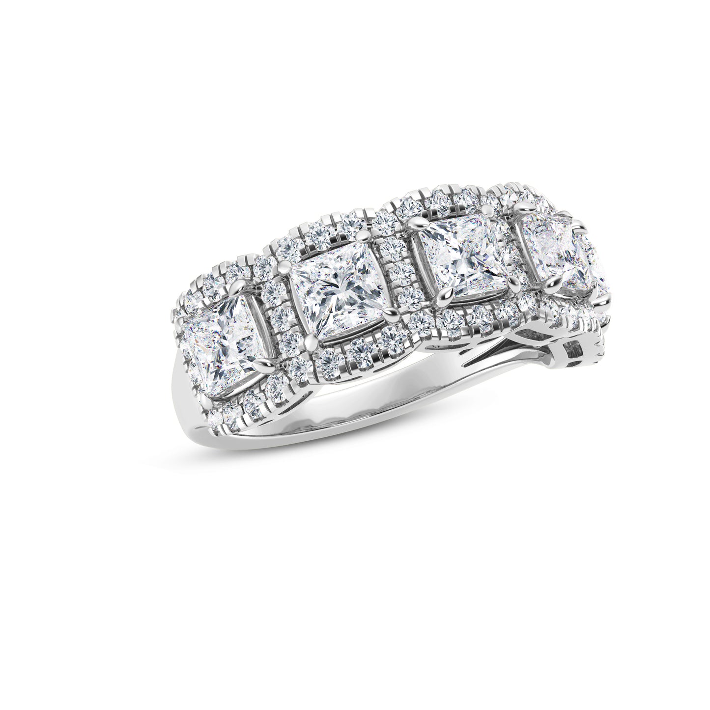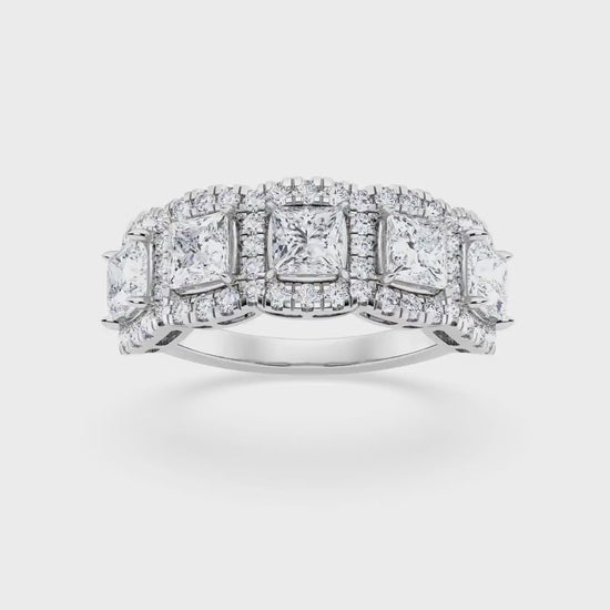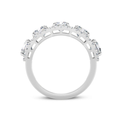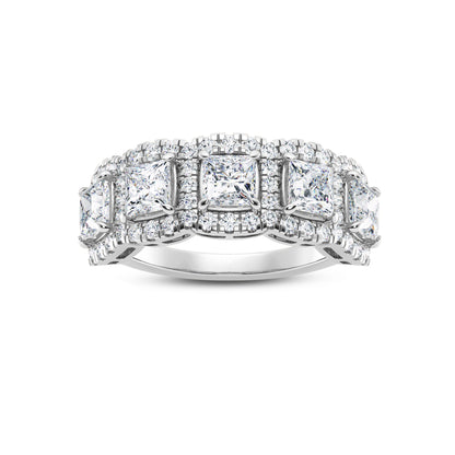 Crafted in luminous 14k white gold, this band ring features a stunning array of princess-cut lab-grown diamonds. The central 3.8mm diamond, boasting a carat weight of 1.50, is surrounded by a harmonious arrangement of round diamonds. Thirty RD1.3mm diamonds contribute 0.30 carats, while an additional thirty RD1.15mm diamonds add 0.22 carats, creating a total carat weight of 2.00.