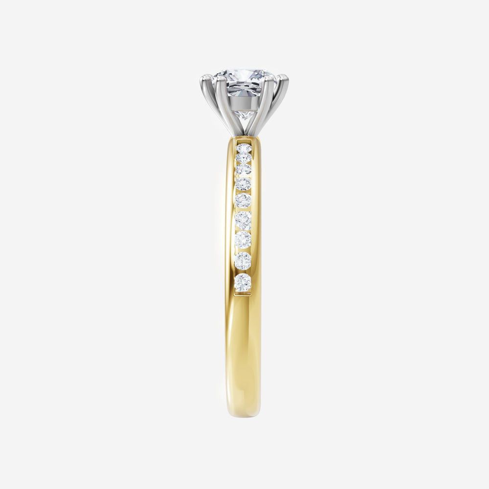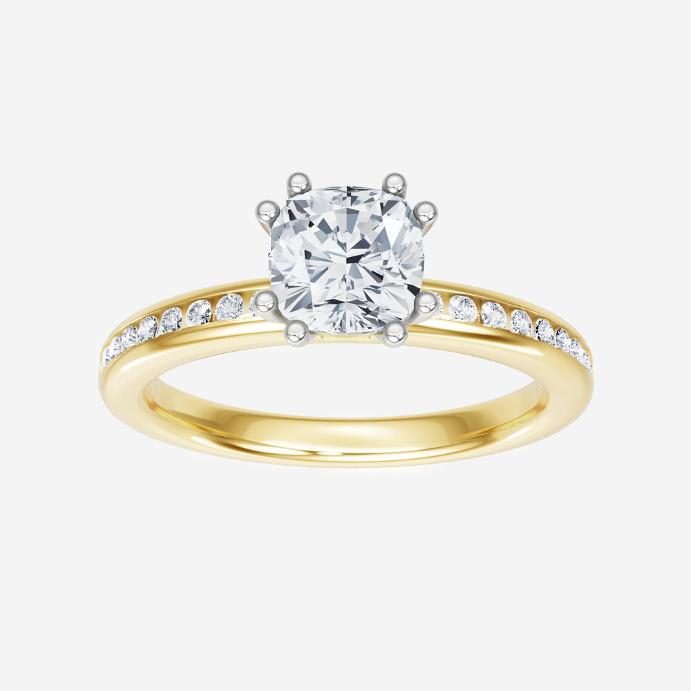 You’ve designed a ring that reflects lasting elegance and grace! Crafted from 14k Yellow White Dual Tone, this exquisite Cushion lab-grown diamond is the centerpiece of this unique design. This Channel Set Shank with a 4 Prong Split Prong head showcases the brilliance of the Cushion diamond, creating a timeless look. This elegant piece is the perfect symbol of love, strength, and timeless beauty.
