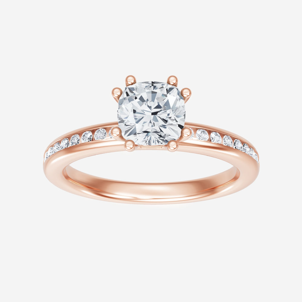 You’ve designed a ring that reflects lasting elegance and grace! Crafted from 18K Rose Gold, this exquisite Cushion lab-grown diamond is the centerpiece of this unique design. This Channel Set Shank with a 4 Prong Split Prong head showcases the brilliance of the Cushion diamond, creating a timeless look. This elegant piece is the perfect symbol of love, strength, and timeless beauty.