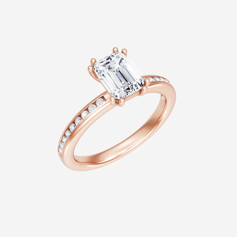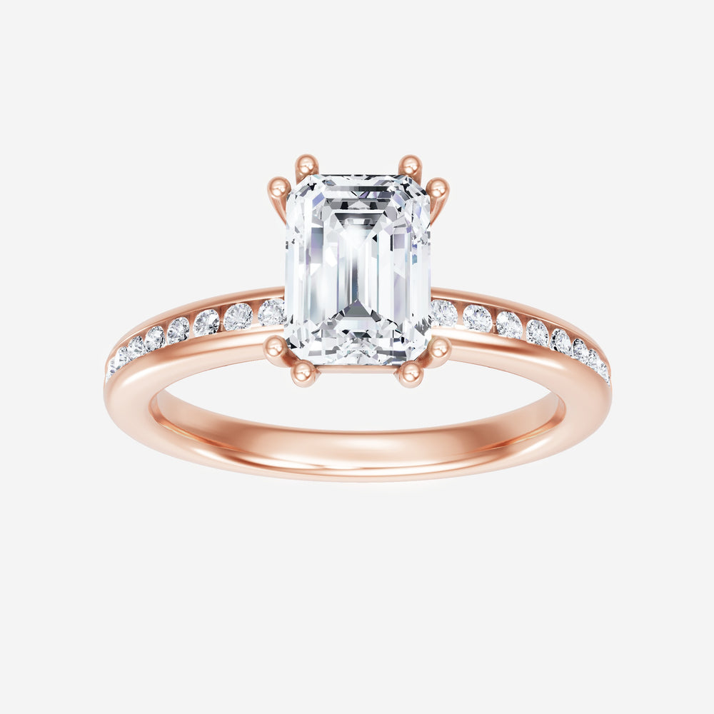 You’ve designed a ring that reflects lasting elegance and grace! Crafted from 18K Rose Gold, this exquisite Emerald lab-grown diamond is the centerpiece of this unique design. This Channel Set Shank with a 4 Prong Split Prong head showcases the brilliance of the Emerald diamond, creating a timeless look. This elegant piece is the perfect symbol of love, strength, and timeless beauty.