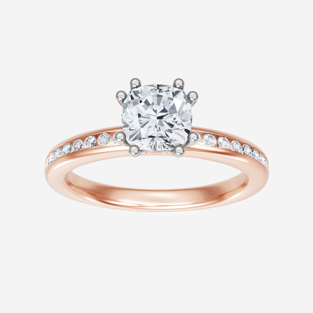 You’ve designed a ring that reflects lasting elegance and grace! Crafted from 18k Rose White Dual Tone, this exquisite Cushion lab-grown diamond is the centerpiece of this unique design. This Channel Set Shank with a 4 Prong Split Prong head showcases the brilliance of the Cushion diamond, creating a timeless look. This stunning ring makes the perfect symbol of everlasting love and devotion.