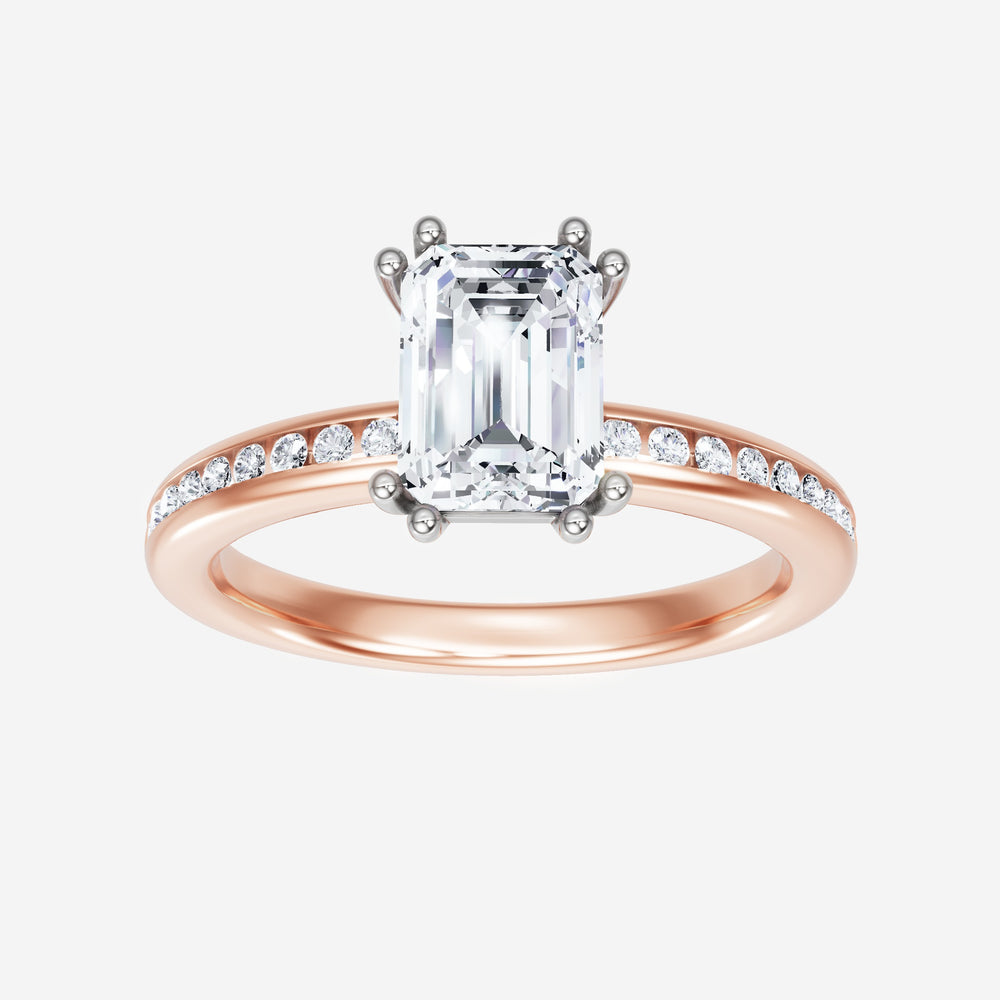 You’ve designed a ring that reflects lasting elegance and grace! Crafted from 18k Rose White Dual Tone, this exquisite Emerald lab-grown diamond is the centerpiece of this unique design. This Channel Set Shank with a 4 Prong Split Prong head showcases the brilliance of the Emerald diamond, creating a timeless look. This stunning ring makes the perfect symbol of everlasting love and devotion.