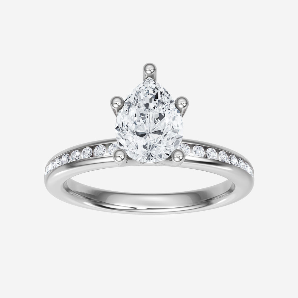 You’ve designed a ring that reflects lasting elegance and grace! Crafted from 18K White Gold, this exquisite Pear lab-grown diamond is the centerpiece of this unique design. This Channel Set Shank with a 5 Prong Head head showcases the brilliance of the Pear diamond, creating a timeless look. Whether as a gift or a personal treasure, this ring will forever symbolize the most meaningful moments in life.