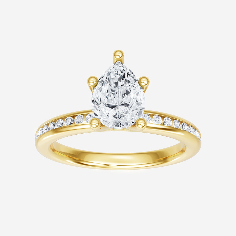 You’ve designed a ring that reflects lasting elegance and grace! Crafted from 18K Yellow Gold, this exquisite Pear lab-grown diamond is the centerpiece of this unique design. This Channel Set Shank with a 5 Prong Head head showcases the brilliance of the Pear diamond, creating a timeless look. This stunning ring makes the perfect symbol of everlasting love and devotion.