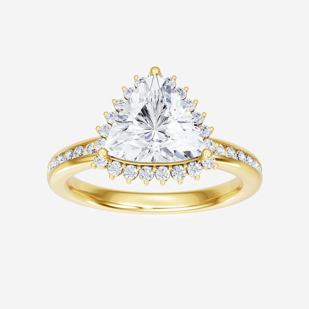 You’ve designed a ring that reflects lasting elegance and grace! Crafted from 18K Yellow Gold, this exquisite Trillion lab-grown diamond is the centerpiece of this unique design. This Channel Set Shank with a 3 Prong Diana Halo head showcases the brilliance of the Trillion diamond, creating a timeless look. This stunning ring makes the perfect symbol of everlasting love and devotion.
