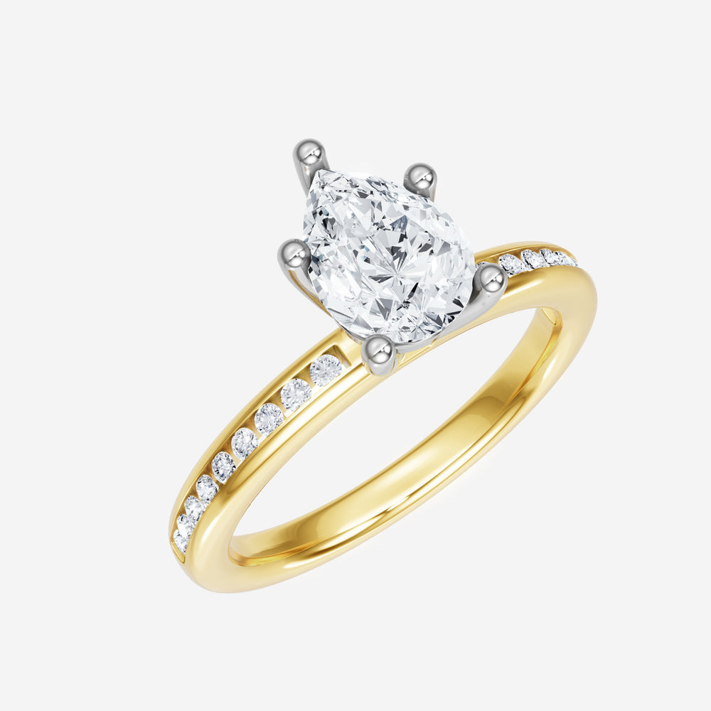 You’ve designed a ring that reflects lasting elegance and grace! Crafted from 18k Yellow White Dual Tone, this exquisite Pear lab-grown diamond is the centerpiece of this unique design. This Channel Set Shank with a 4 Prong Flower Head head showcases the brilliance of the Pear diamond, creating a timeless look. This stunning ring makes the perfect symbol of everlasting love and devotion.