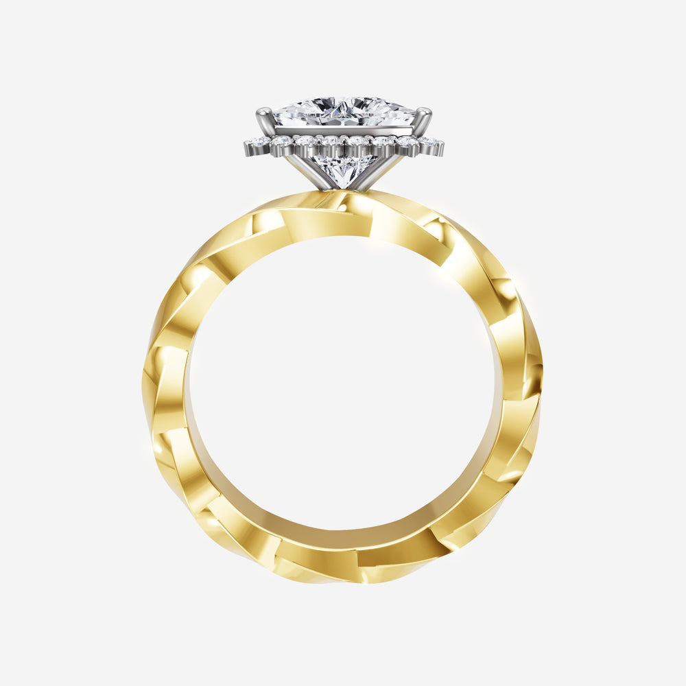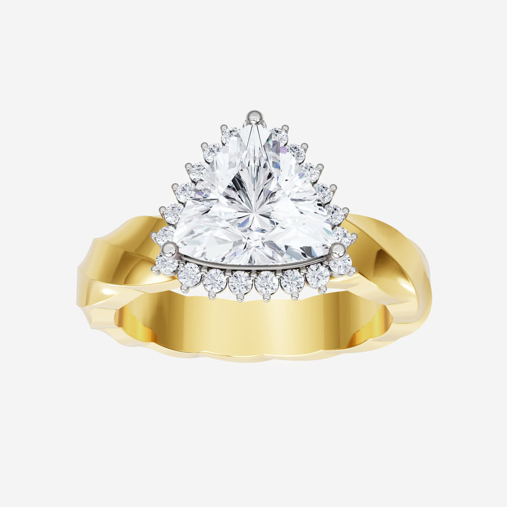 You’ve designed a ring that reflects lasting elegance and grace! Crafted from 18k Yellow White Dual Tone, this exquisite Trillion lab-grown diamond is the centerpiece of this unique design. This Twisted Shank with a 3 Prong Diana Halo head showcases the brilliance of the Trillion diamond, creating a timeless look. It's a piece of elegance and beauty, perfect for marking life's most beautiful occasions.