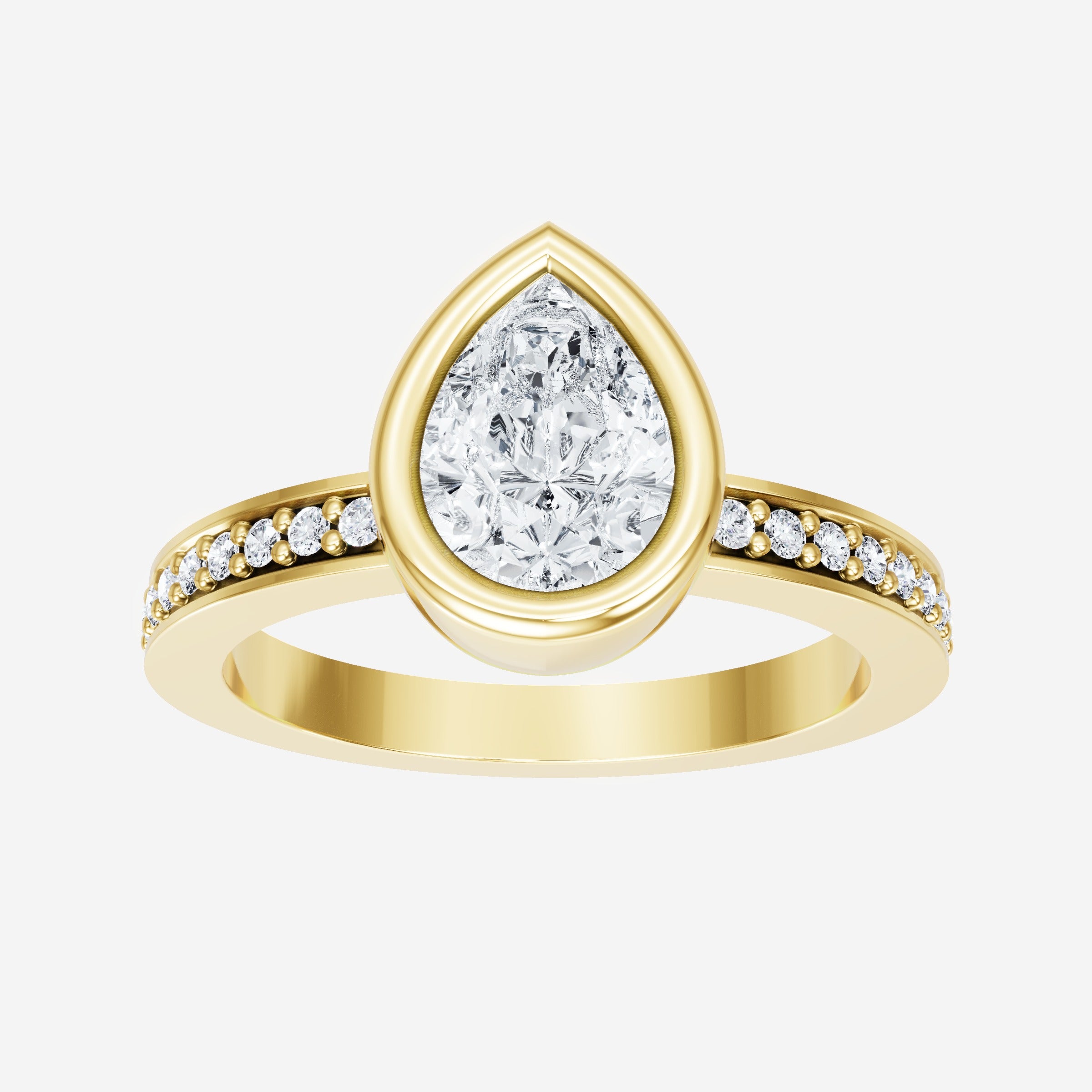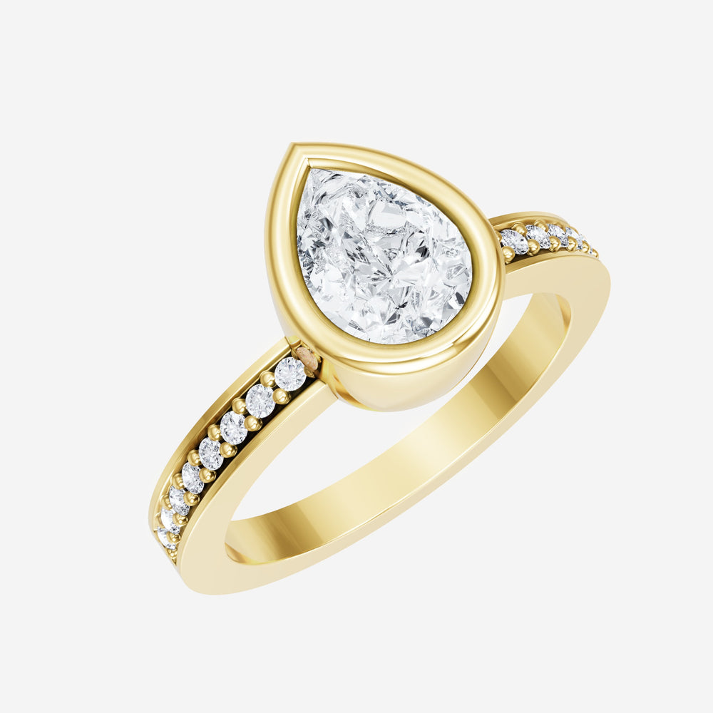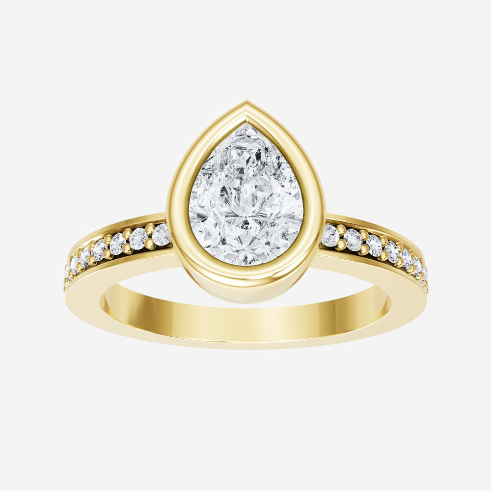 You’ve designed a ring that reflects lasting elegance and grace! Crafted from 14K Yellow Gold, this exquisite Pear lab-grown diamond is the centerpiece of this unique design. This Single Pave Shank with a Bezel Set Center head showcases the brilliance of the Pear diamond, creating a timeless look. This stunning ring makes the perfect symbol of everlasting love and devotion.