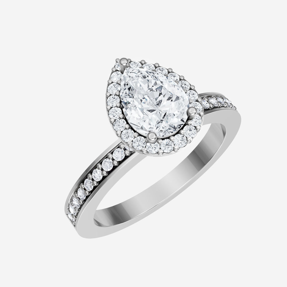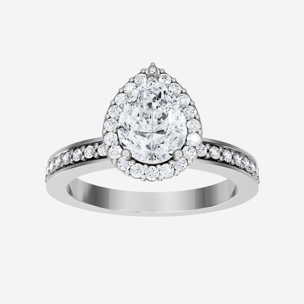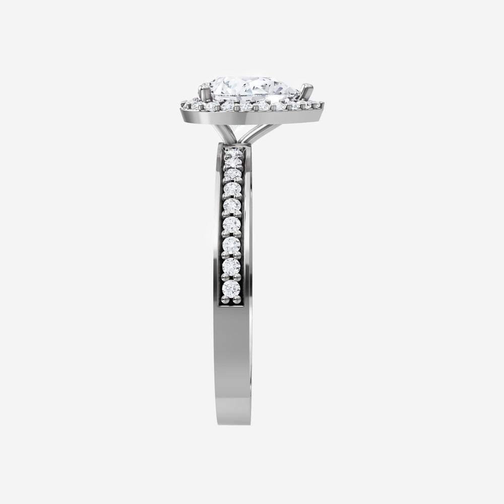 You’ve designed a ring that reflects lasting elegance and grace! Crafted from 18K White Gold, this exquisite Pear lab-grown diamond is the centerpiece of this unique design. This Single Pave Shank with a Single Halo head showcases the brilliance of the Pear diamond, creating a timeless look. This ring will become a cherished reminder of life's most treasured moments.