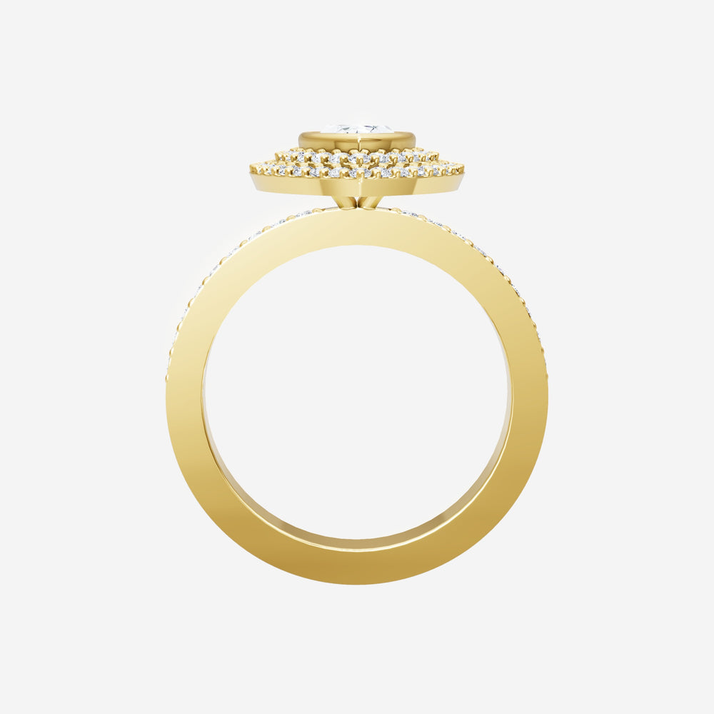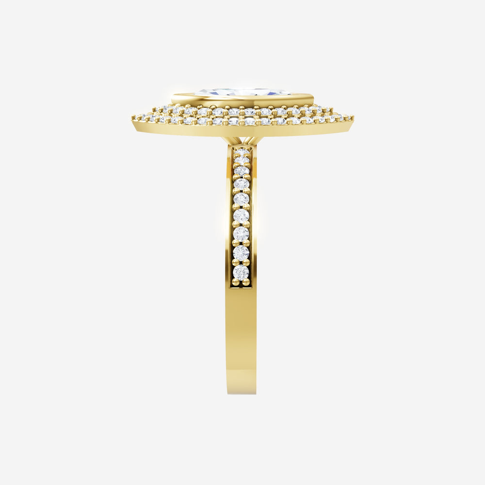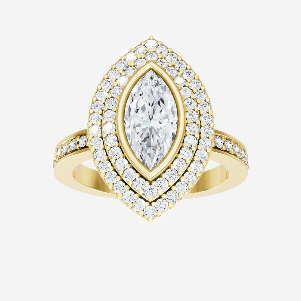 You’ve designed a ring that reflects lasting elegance and grace! Crafted from 14K Yellow Gold, this exquisite Marquise lab-grown diamond is the centerpiece of this unique design. This Single Pave Shank with a Bezel Set Center With Double Halo head showcases the brilliance of the Marquise diamond, creating a timeless look. This ring will become a cherished reminder of life's most treasured moments.