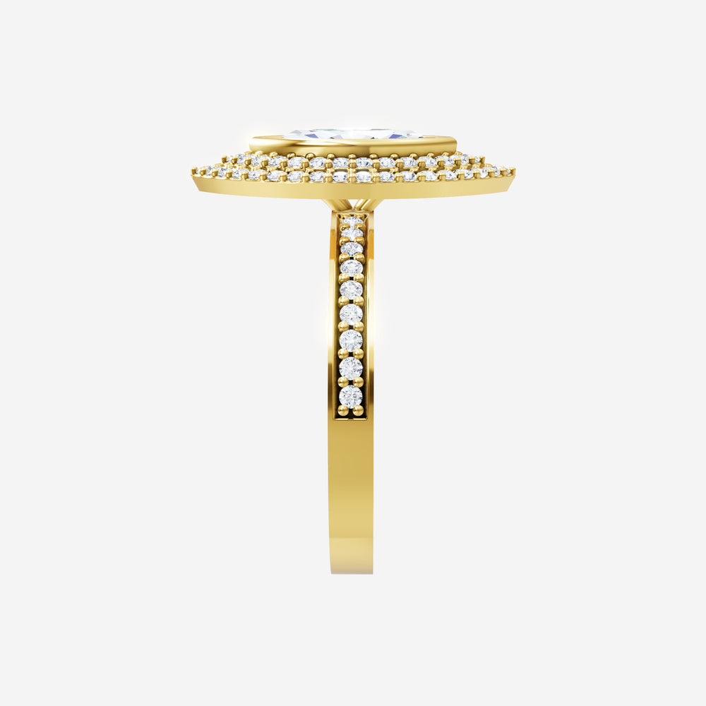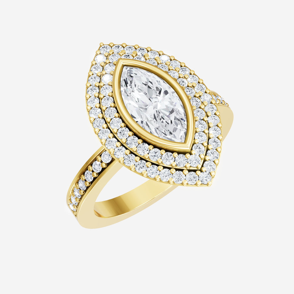 You’ve designed a ring that reflects lasting elegance and grace! Crafted from 18K Yellow Gold, this exquisite Marquise lab-grown diamond is the centerpiece of this unique design. This Single Pave Shank with a Bezel Set Center With Double Halo head showcases the brilliance of the Marquise diamond, creating a timeless look. This elegant piece is the perfect symbol of love, strength, and timeless beauty.