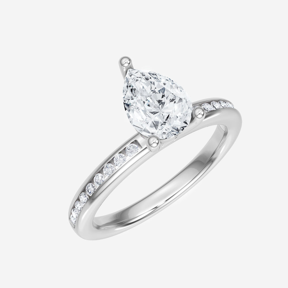 You’ve designed a ring that reflects lasting elegance and grace! Crafted from 14K White Gold, this exquisite Pear lab-grown diamond is the centerpiece of this unique design. This Channel Set Shank with a 3 Prong Head head showcases the brilliance of the Pear diamond, creating a timeless look. A perfect choice to celebrate love, commitment, and everything in between.