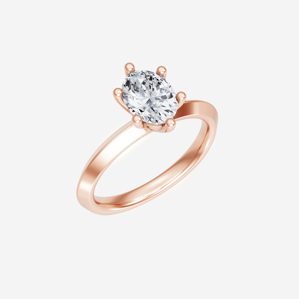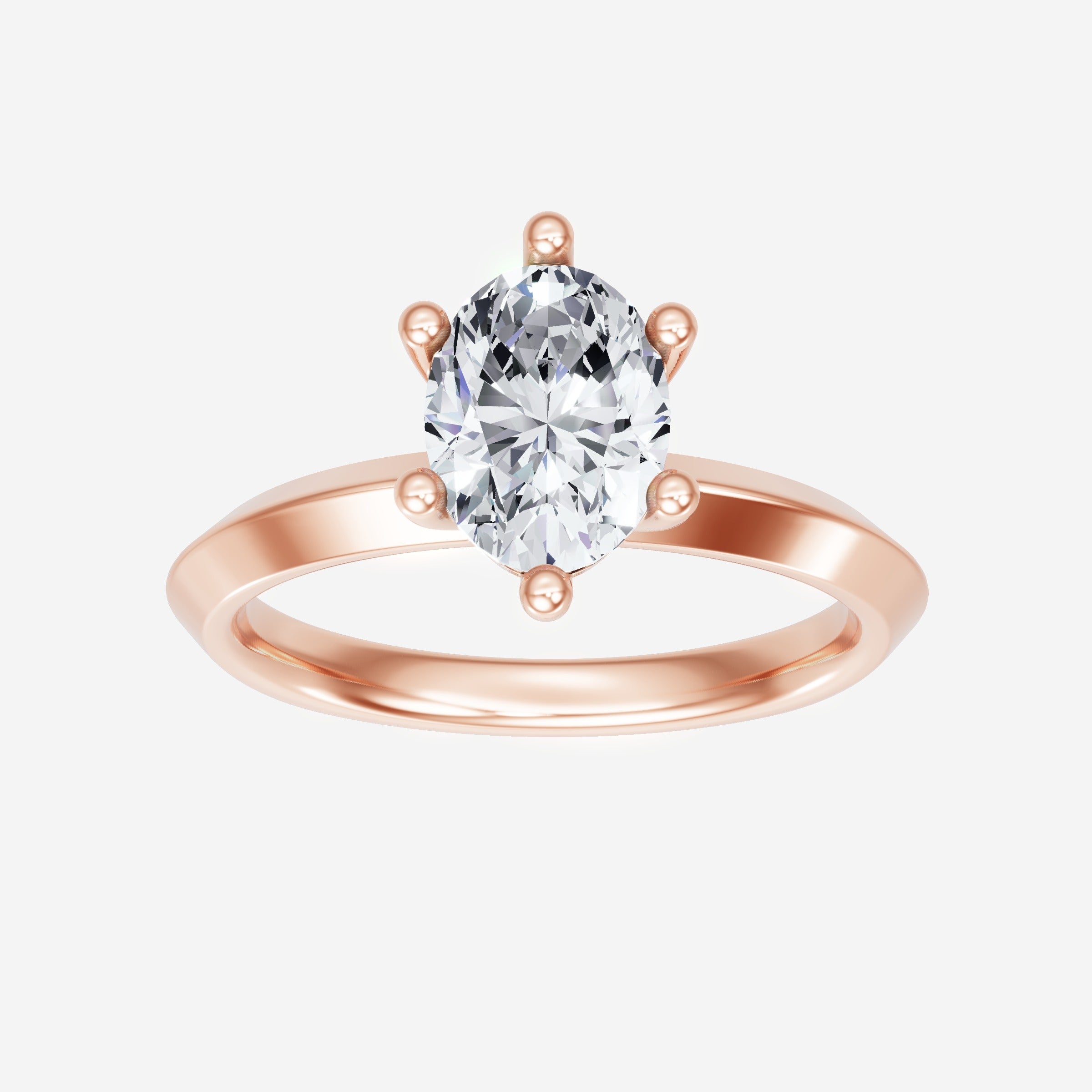 You’ve designed a ring that reflects lasting elegance and grace! Crafted from 14k Rose Gold, this exquisite Oval lab-grown diamond is the centerpiece of this unique design. This Knife Edge Shank with a 6 Prong Head head showcases the brilliance of the Oval diamond, creating a timeless look. A perfect choice to celebrate love, commitment, and everything in between.